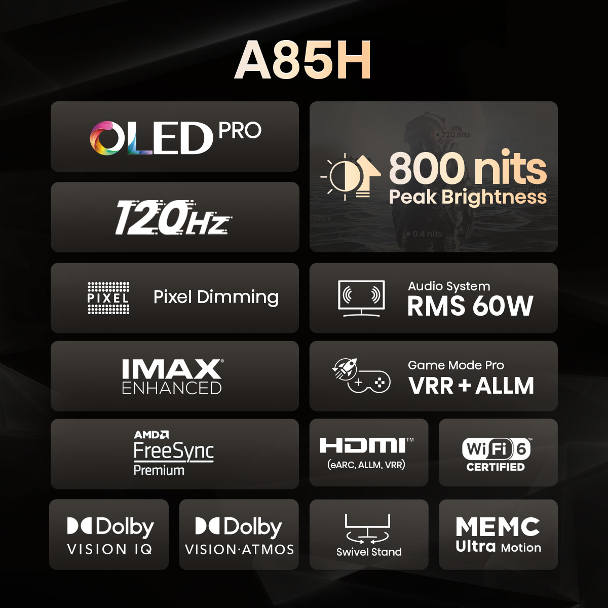 ?【OLED EV panel】Prefect blacks & richest details ?【Native 120Hz】Support a smooth and real-time response ?【Pixel Dimming】Every pixel is self-luminous and can be switched ON/OFF for clear edges, rich details and vivid colour ?【Dolby Vision IQ & Atmos】Experience the most realistic holographic "surround" impact ?【RMS 60W】4 x 10W + 2 x 10W Speakers, bring you an immersive sound experience, just like sitting in the sence ?【WIFI 6】802.11ax - Faster WiFi speed ensures no buffering when watching high-resolution movies ?【IMAX Enhanced】Deliver IMAX signature pictures to your home. Bring Cinema Home. ?【Filmmaker mode】One-click reset to the original picture and sound. ?【HDR 10+】Highest brightness level of High Dynamic Range possible ?【Airplay & Homekit】Wireless stream content or control from your Apple device to the TV (Coming Soon) ?【MEMC】 Fast motion smoothing refresh rates ?【Game Mode Pro】AMD FreeSync Premium + Low Latency VRR+ALLM, experience no lag in FPS games ?【Swivel Stand】Easily swivel by up to 50° without moving the whole TV set suit for different using scenarios ?【4K Upscaling】4K resolution powered by AI chips ?【Hi-View Image Engine】 64bit Quad Core ARM Cortex-A72 up to 1.7GHz ?【Smart TV】Pre-Programmed with Youtube, Netflix, Disney+ and other popular smart TV apps ?【Anyview Cast】Cast your phone or other smart devices' screen to TV ?【Voice command】Voice control your TV and smart home devices, a hands-free experience ?【Bluetooth remote】Longer distance 360° control compare to a traditional infrared controller ?【Wireless】Supports 2.4G and 5G dual wifi and Bluetooth 5.0 ?【Built-in ports】2 x HDMI 2.1 (1 x eARC), 2 x HDMI 2.0, 1 x USB3.0, 1 x USB2.0, Ethernet (Lan)