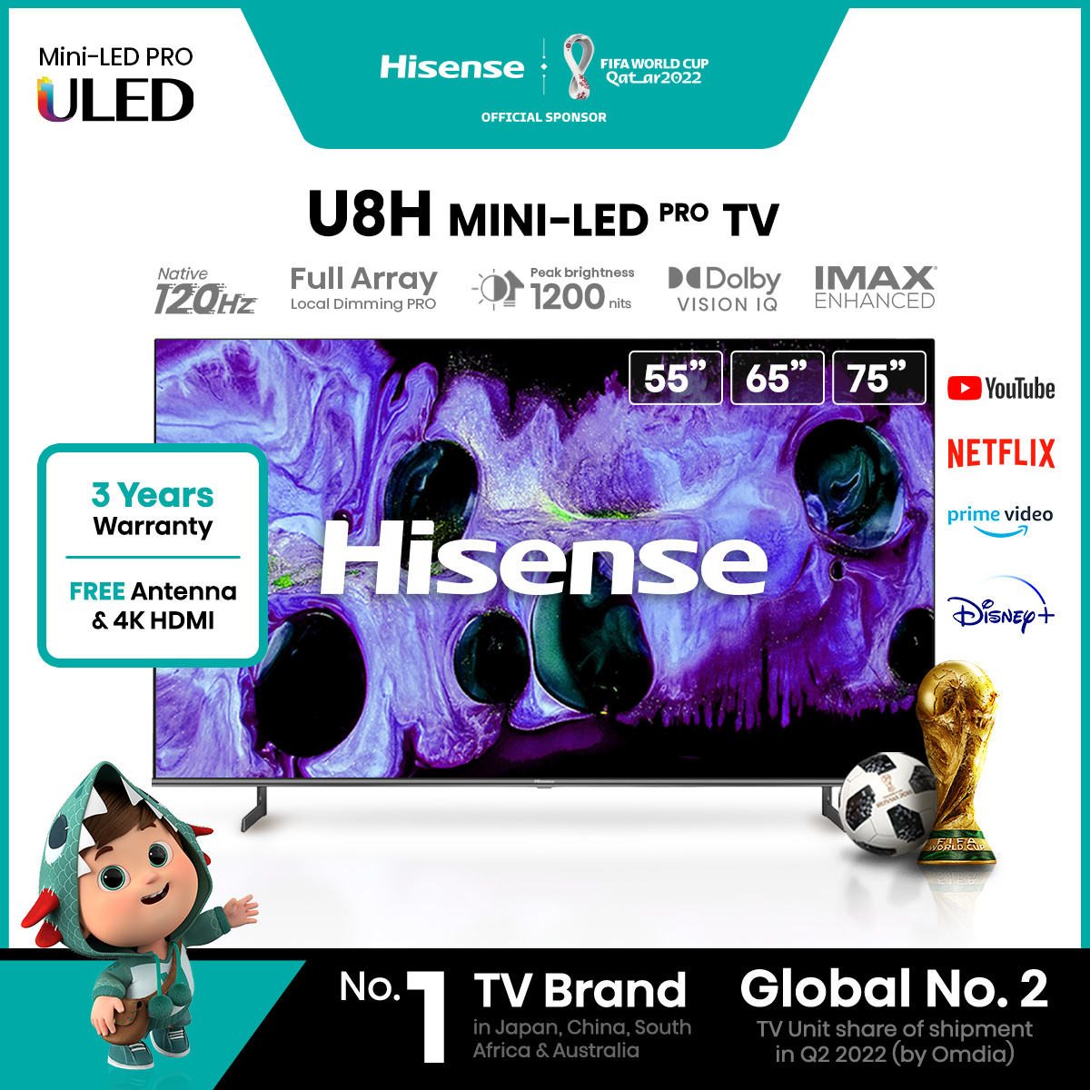 [2022] Hisense U8H 55" 65" 75" MiniLED | 120Hz Refresh Rate | Dolby Vision IQ | Dolby Atmos | IMAX Enhanced | 1200nits brightness | HDMI 2.1 eARC | Wifi 6 | MEMC | FreeSync VRR ALMM | Full Array Local