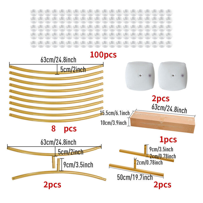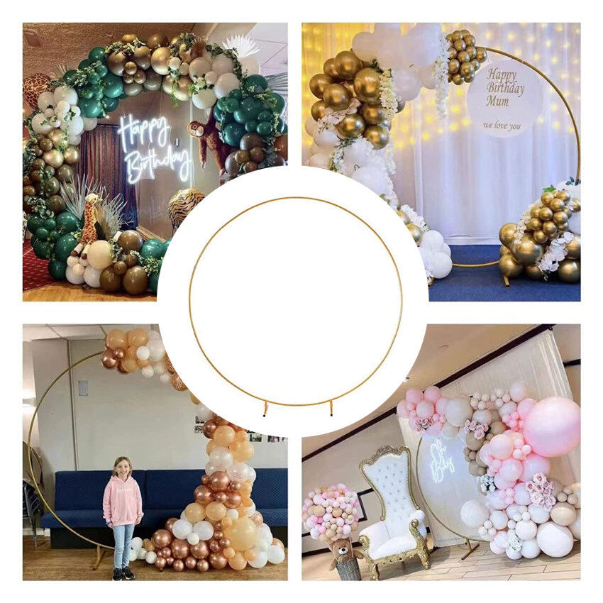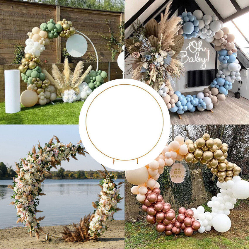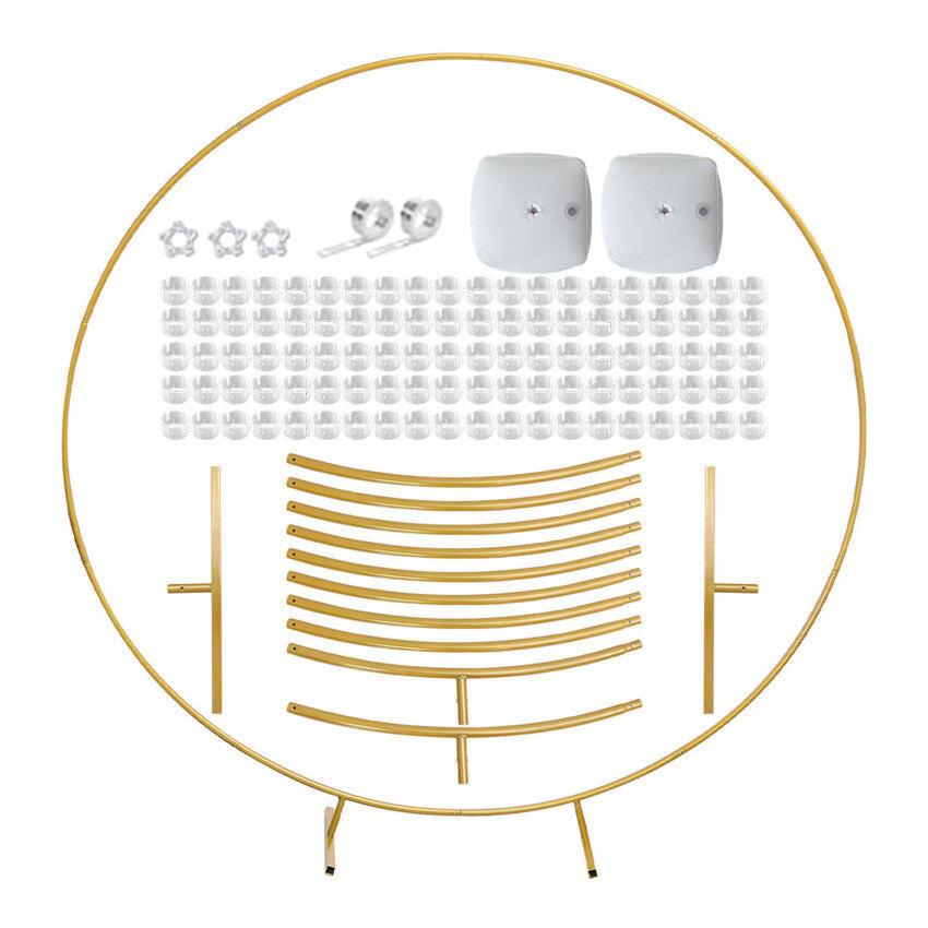 ?WHAT YOU GET: Comprehensive Upgraded plants vines Version Iron Circle Wedding Props, Round Balloon Arch Kit(9 arched iron tubes, 2 arched iron tubes with feet, 2 T-shaped bases, 2 water bags,100 balloon clips,2 balloon Glue Point, 3balloon tape strips,).