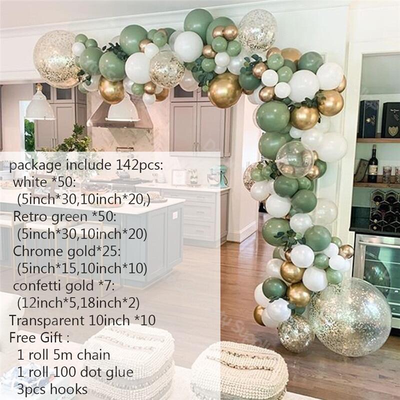 142pcs Balloons Garland Kit Birthday Retro Dusty green Balloon Arch Chrome Gold Confetti Globos Baby Shower Wedding Party Decor