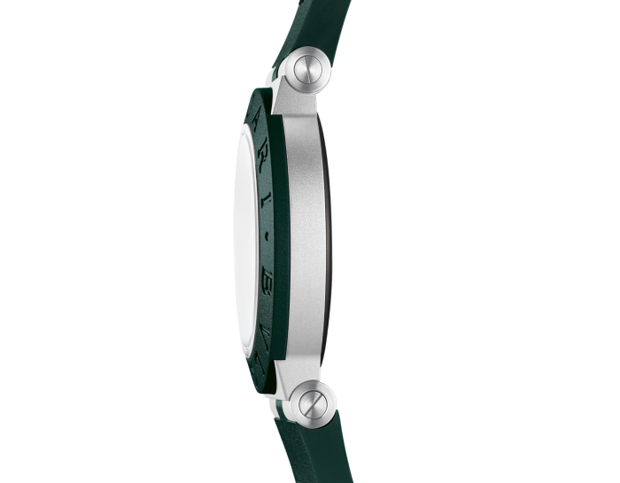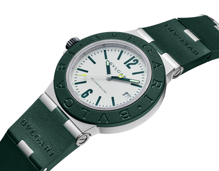 BULGARI BULGARI ALUMINUM WATCH IS UNIQUE, BOLDLY SURPASSING TRENDS AND TIMES, AND REDEFINING THE CONCEPT OF LUXURY SPORTS WATCHES. EQUIPPED WITH A LEFT-HAND OPERATED CROWN AND A VELCRO STRAP THAT ENSURES A SNUG FIT AND COMFORT ON THE WRIST, THIS SPECIAL EDITION IS DESIGNED FOR TENNIS LOVERS AS WELL AS THOSE WHO LOVE THE PLAYFUL SPIRIT OF THIS CLASSIC TIMEPIECE. THE WATCH BOLDLY USES AN UNEXPECTED COMBINATION OF MATERIALS, EQUIPPED WITH THE FAMOUS ALUMINUM CASE, DARK GREEN RUBBER BEZEL AND STRAP, WHICH COMPLEMENTS THE WHITE DIAL AND ENGRAVED TENNIS PATTERN ON THE BACK. THIS MODEL COMES IN SPECIAL PACKAGING REMINISCENT OF TENNIS BALLS.