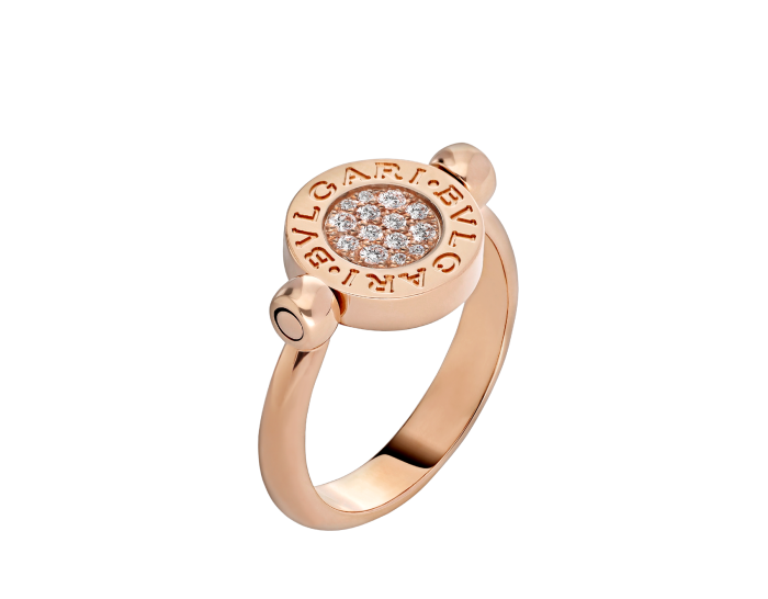 BVLGARI BVLGARI FLIP RING IN 18K ROSE GOLD, SET WITH EMERALDS AND PAVÉ DIAMONDS.