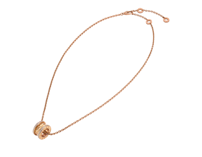 THE B.ZERO1 ROCK SERIES 18K ROSE GOLD NECKLACE DRAWS INSPIRATION FROM THE FAMOUS AMPHITHEATRE, THE COLOSSEUM, AND DEMONSTRATES BULGARI'S UNIQUE, BOLD AND UNINHIBITED CREATIVE PERSPECTIVE IN A GROUNDBREAKING WAY. THE COLLECTION'S CLASSIC, PURE SPIRAL SHAPE, EXPRESSED THROUGH THE STRONG LINES OF THE PENDANT, IS REINTERPRETED WITH GOLD-TONE STUDS, EDGED WITH PAVÉ PRECIOUS DIAMONDS, EMPHASIZING THE UNINHIBITED NATURE OF THIS INNOVATIVE DESIGN MASTERPIECE.