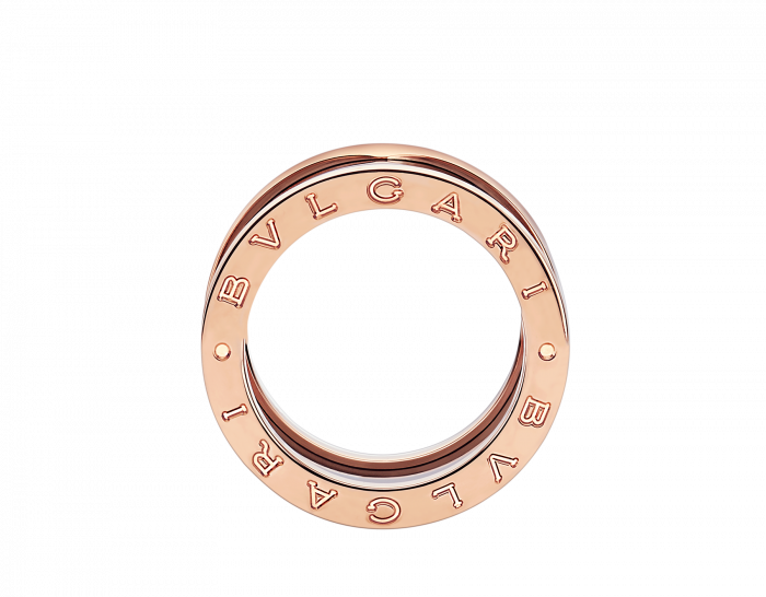 DRAWING INSPIRATION FROM THE WORLD-FAMOUS AMPHITHEATRE, THE COLOSSEUM, THE B.ZERO1 RING TRULY DEMONSTRATES BULGARI'S CREATIVE VISION AND CHALLENGES THE VERY ESSENCE OF JEWELRY DESIGN. ITS UNIQUE AND PURE SPIRAL SHAPE SYMBOLIZES THE HARMONY OF PAST, PRESENT AND FUTURE - WHICH IS REFLECTED IN THE SPLENDOR OF THE ETERNAL CITY - AND THE PIONEERING SPIRIT OF THE COLLECTION. B.ZERO1 FOUR-BAND RING IN 18K ROSE GOLD DECORATED WITH BLACK CERAMIC