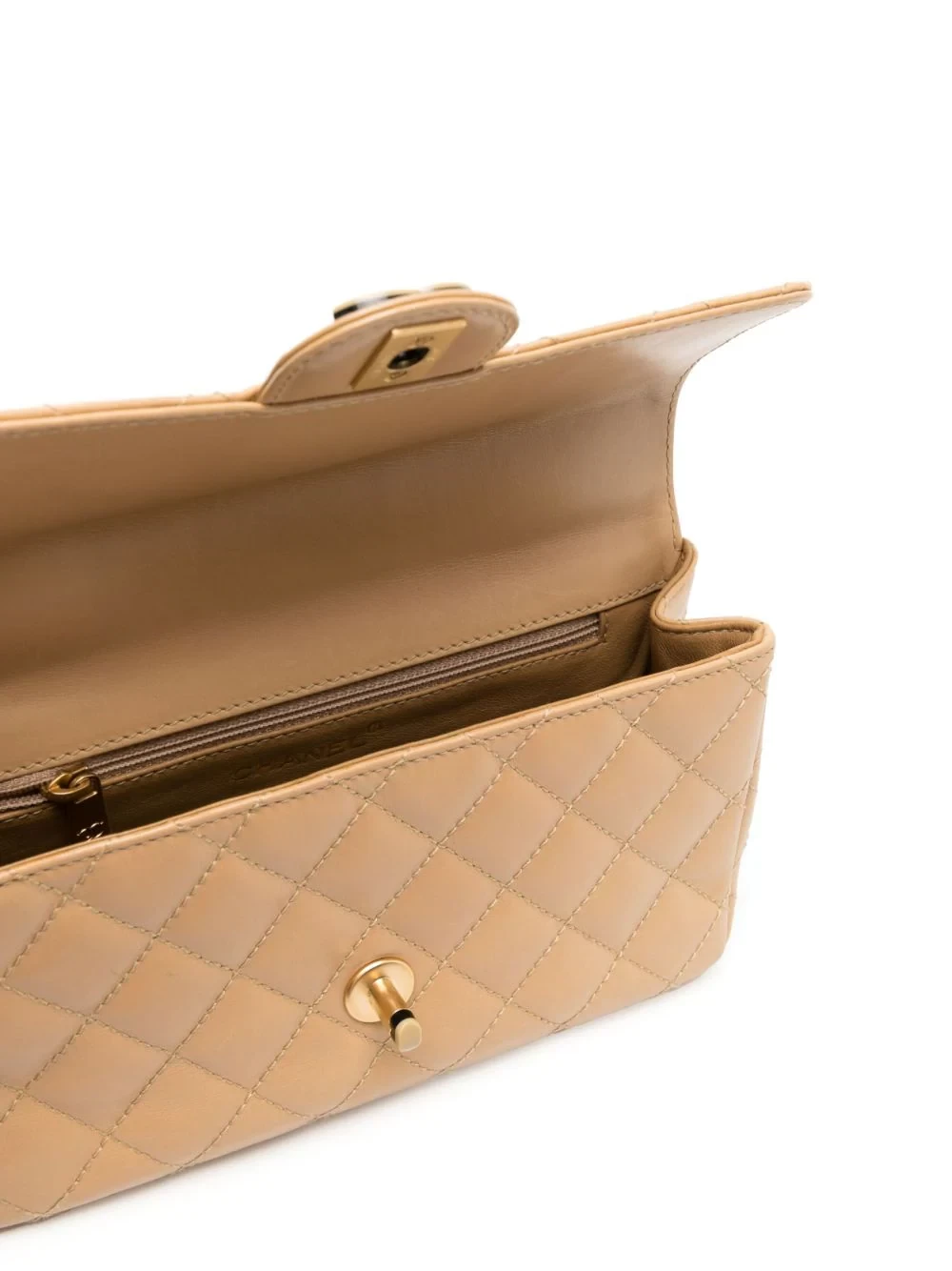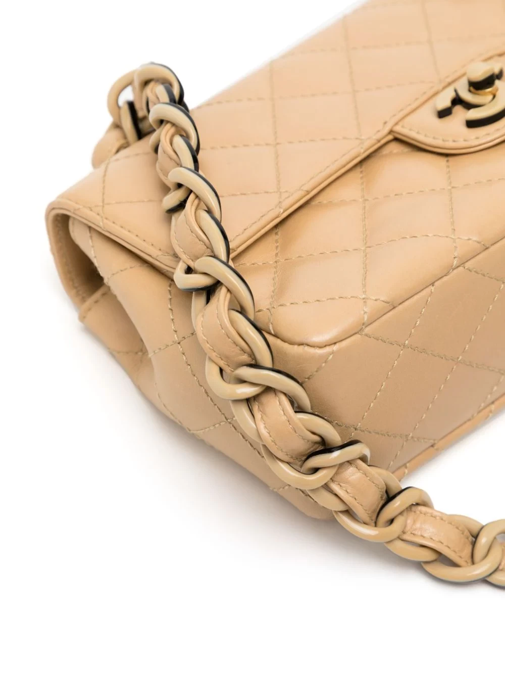 Beige, lambskin, diamond quilting, leather chain shoulder straps, front flip opening and closing, iconic CC buckle, main interlayer, built-in zipper pocket, built-in logo mark, rear pocket, gold hardware accessories.