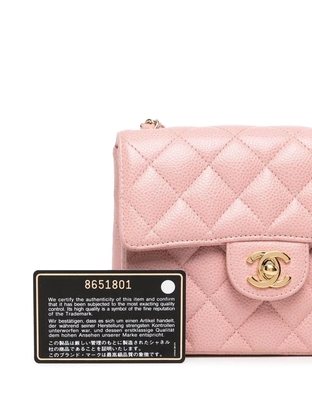 Blush powder, diamond quilting, top flip, iconic CC buckle, removable leather chain shoulder strap, built-in logo tag, built-in zipper pocket, leather lining, gold hardware, square.