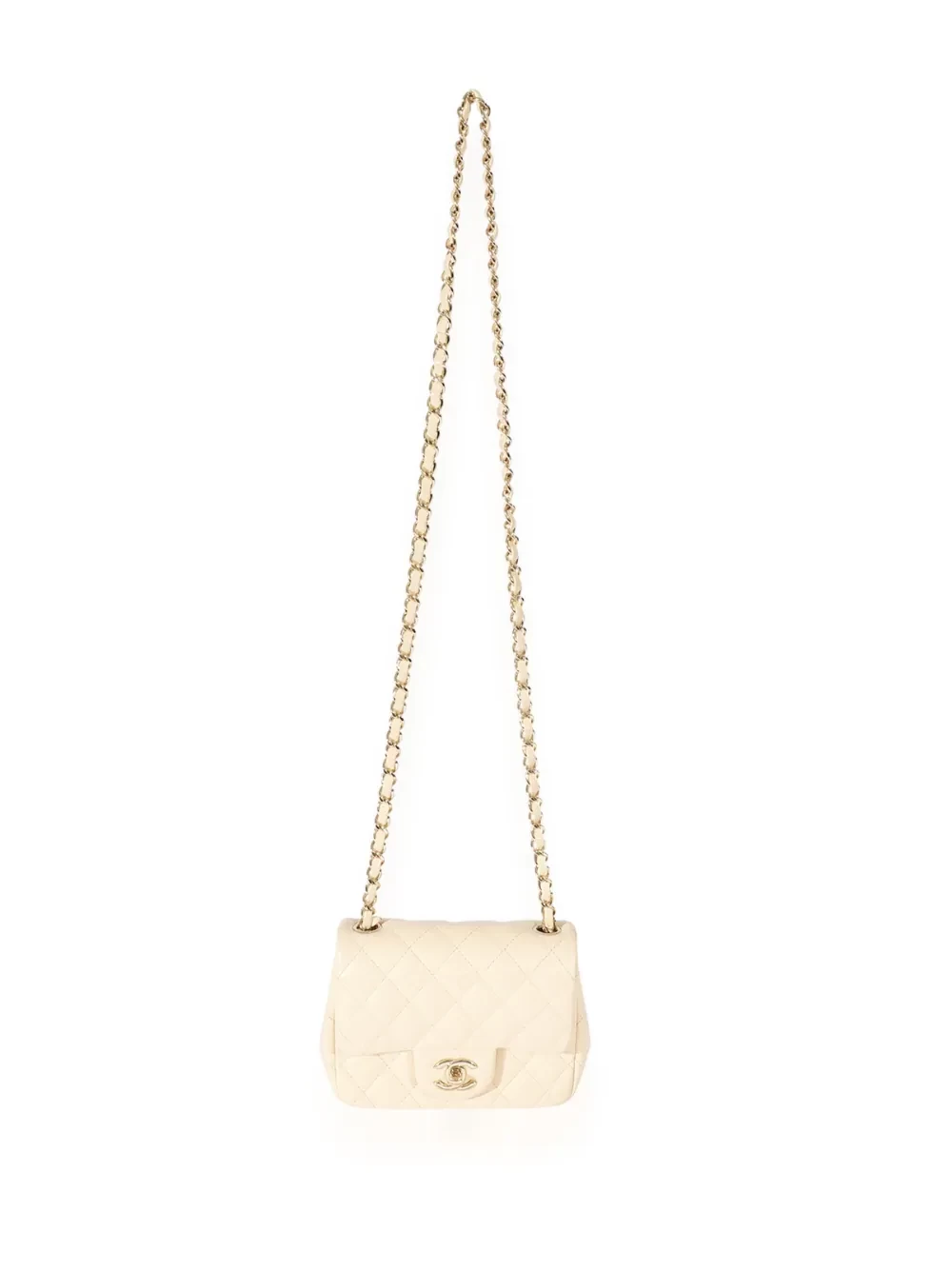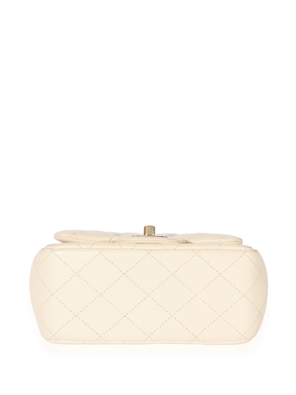 Light beige, lambskin, diamond quilted, leather chain shoulder straps, top flip, iconic CC buckle, built-in zipper pocket, built-in patch bag, built-in logo mark, leather lining, gold hardware accessories, rectangle.