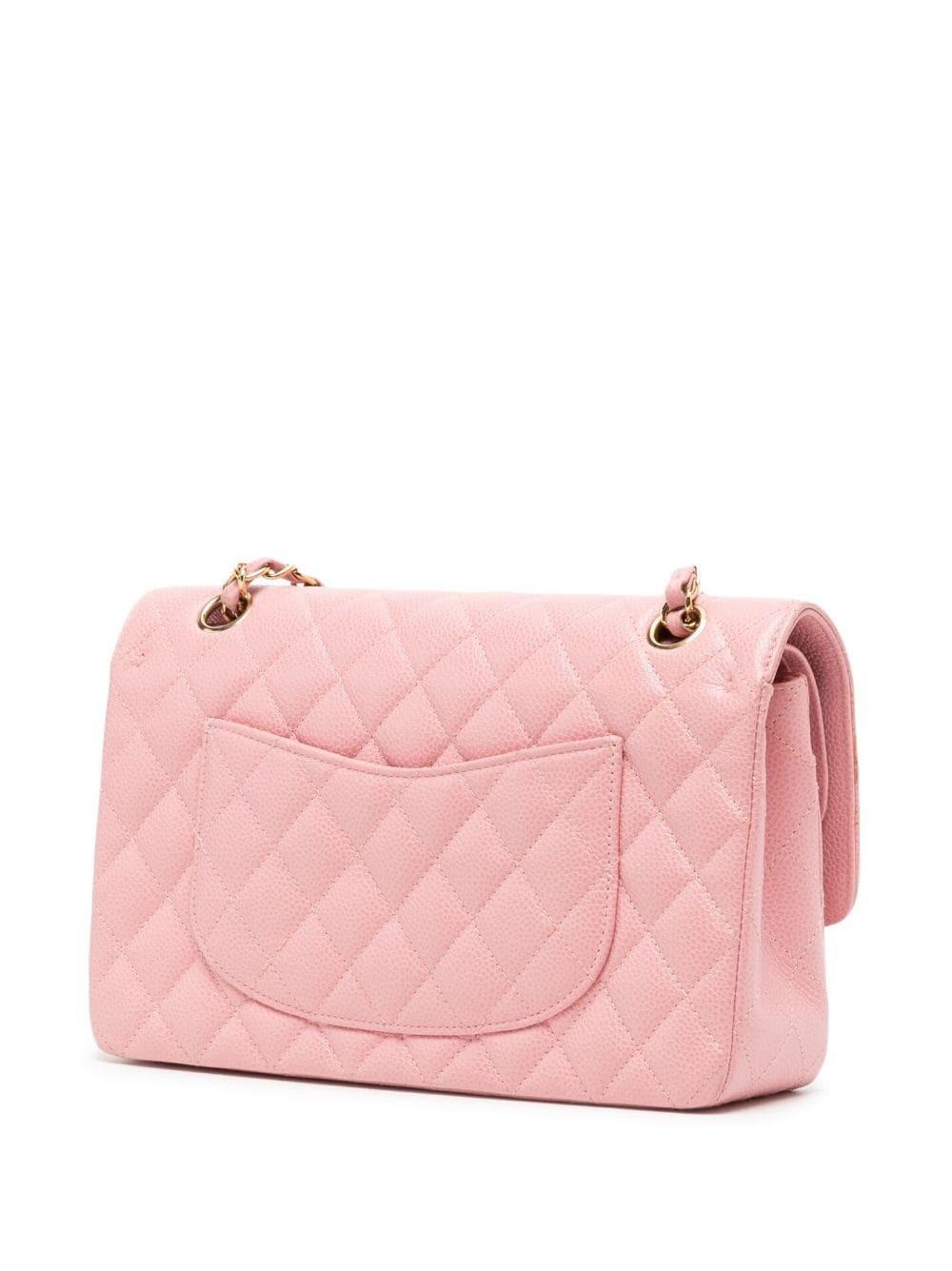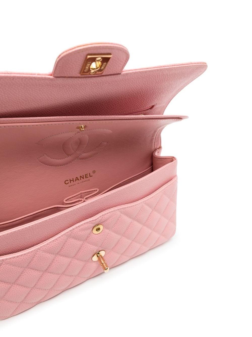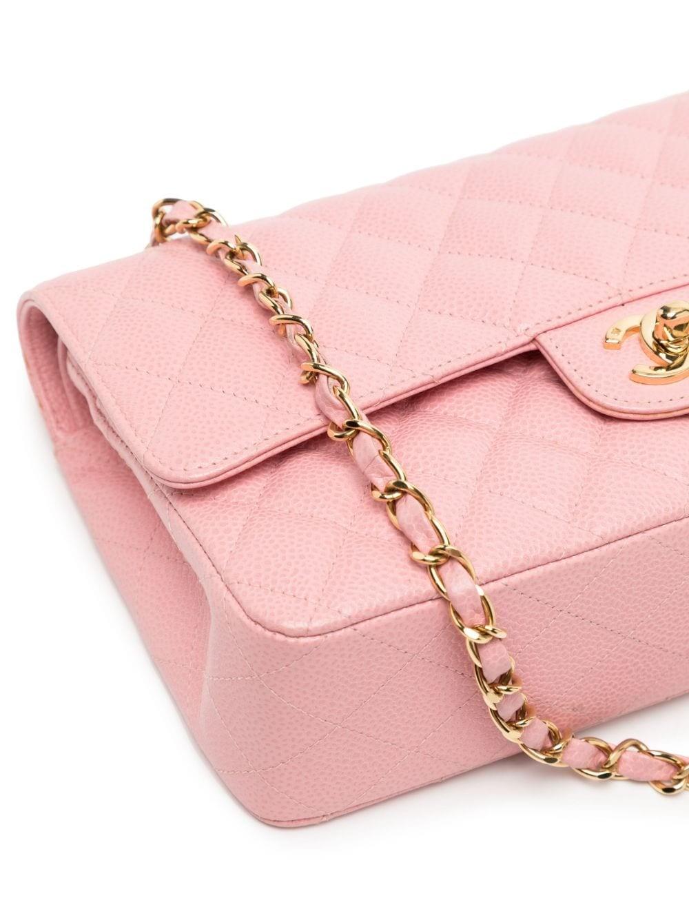 Light pink, caviar leather, diamond quilting, leather chain shoulder straps, iconic double flip design, iconic CC buckle, main mezzanine, built-in pockets, multiple patch bags, built-in zipper pockets, built-in iconic buckle CC logo, built-in logo marks, rear pockets, gold hardware accessories.