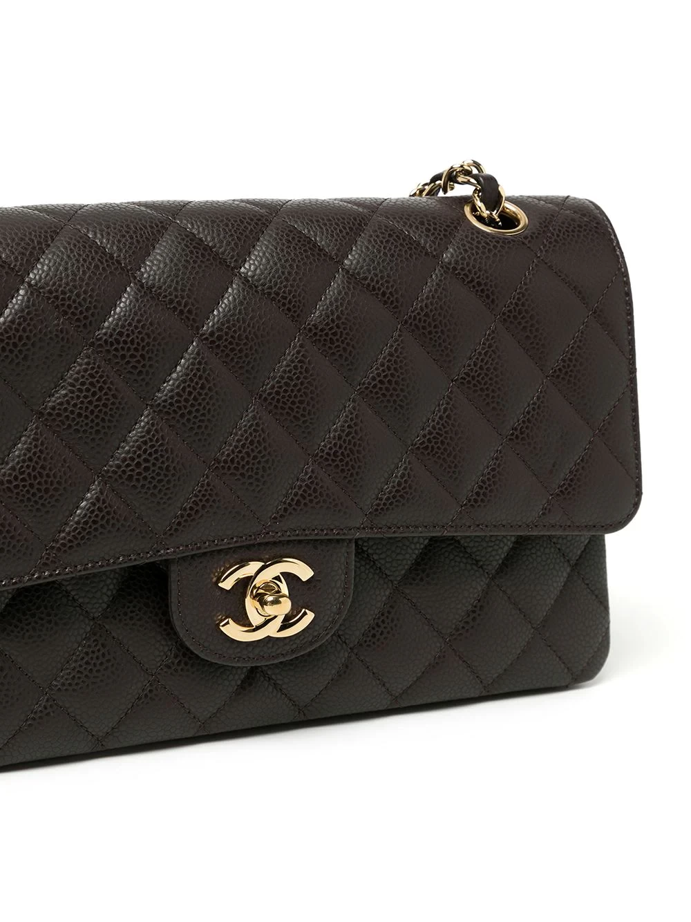 Diamond quilting, leather chain shoulder straps, iconic double flip design, iconic CC buckle, main interlayer, built-in bag, built-in bag, built-in zipper pocket, built-in iconic buckle CC logo, built-in logo mark, rear pocket, gold hardware accessories.