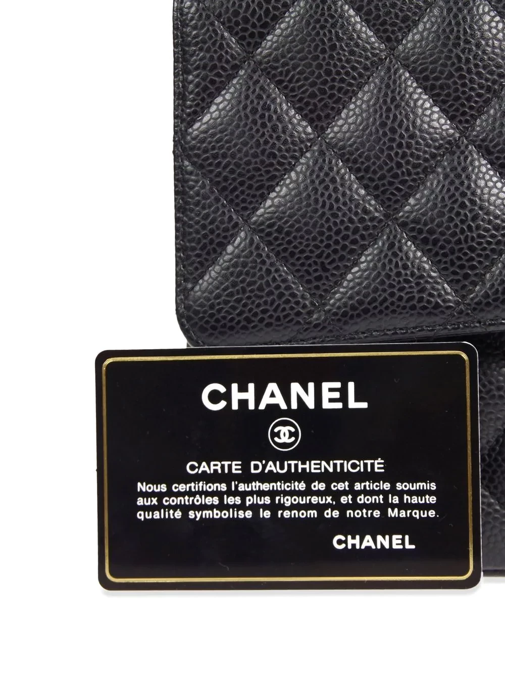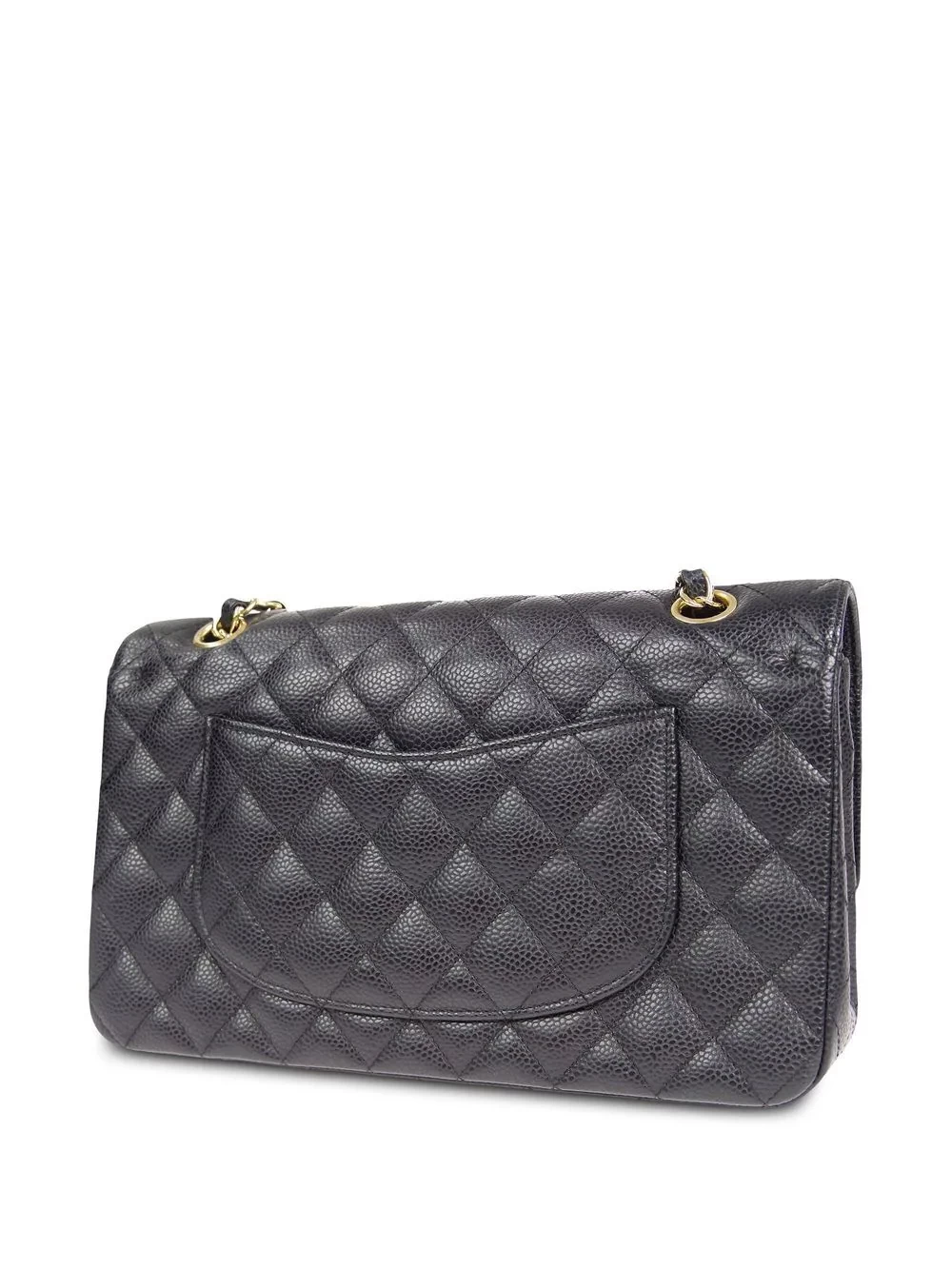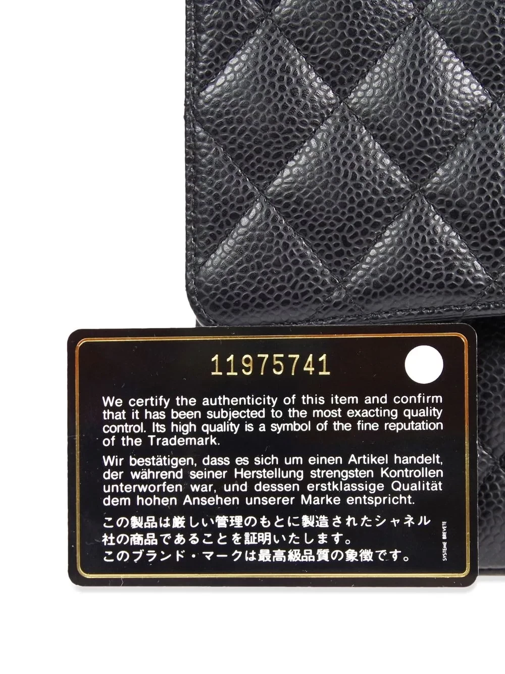 Black, caviar leather, diamond quilted, iconic CC buckle, iconic double flip design, front pocket, partition compartment, multiple built-in pockets, rear pockets, adjustable leather chain straps.