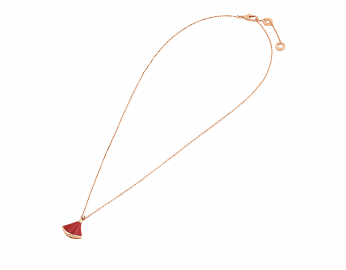 INSPIRED BY FEMININE ELEGANCE AND THE ALLURE OF THE ETERNAL CITY, THE DIVAS' DREAM NECKLACE PAYS HOMAGE TO THE MOST GLAMOROUS WOMEN WITH A UNIQUE ROMAN SPIRIT. FEMININE AND REFINED, THIS NECKLACE EMBODIES THE RICHNESS OF THE BATHS OF CARACALLA MARBLE AND THE ALLURING CURVES OF THE SCALLOPED MOSAICS, THE TRUE ESSENCE OF ITALIAN AESTHETICS. DIVAS' DREAM NECKLACE IN 18K ROSE GOLD, SET WITH CARNELIAN AND DIAMONDS. LENGTH 16-17 INCHES (41-43 CM).