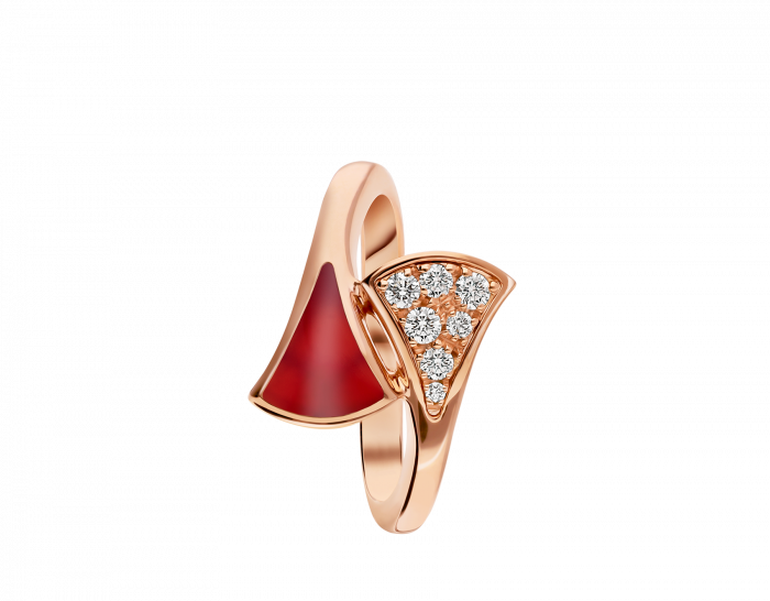 THE DIVAS' DREAM SERIES OF RINGS EMBODIES THE ELEGANT CHARM OF ITALIAN STYLE, RELEASING THE POWER OF WOMEN WITH MYSTERIOUS AND UNFORGETTABLE TEMPERAMENT. THE GLAMOROUS AND EXQUISITE RING IS DECORATED WITH A FAN-SHAPED PATTERN, WHICH DRAWS INSPIRATION FROM THE MOSAIC DECORATION OF THE BATHS OF CARACALLA IN ROME (BATHS OF CARACALLA), AND HIGHLIGHTS THE RELATIONSHIP BETWEEN BVLGARI AND THE "ETERNAL CITY" ROME WITH MODERN FASHION DESIGN AND EXQUISITE GEMSTONE COMBINATION. HISTORICAL ORIGINS. DIVAS' DREAM RING IN 18K ROSE GOLD SET WITH CARNELIAN AND PAVÉ DIAMONDS.