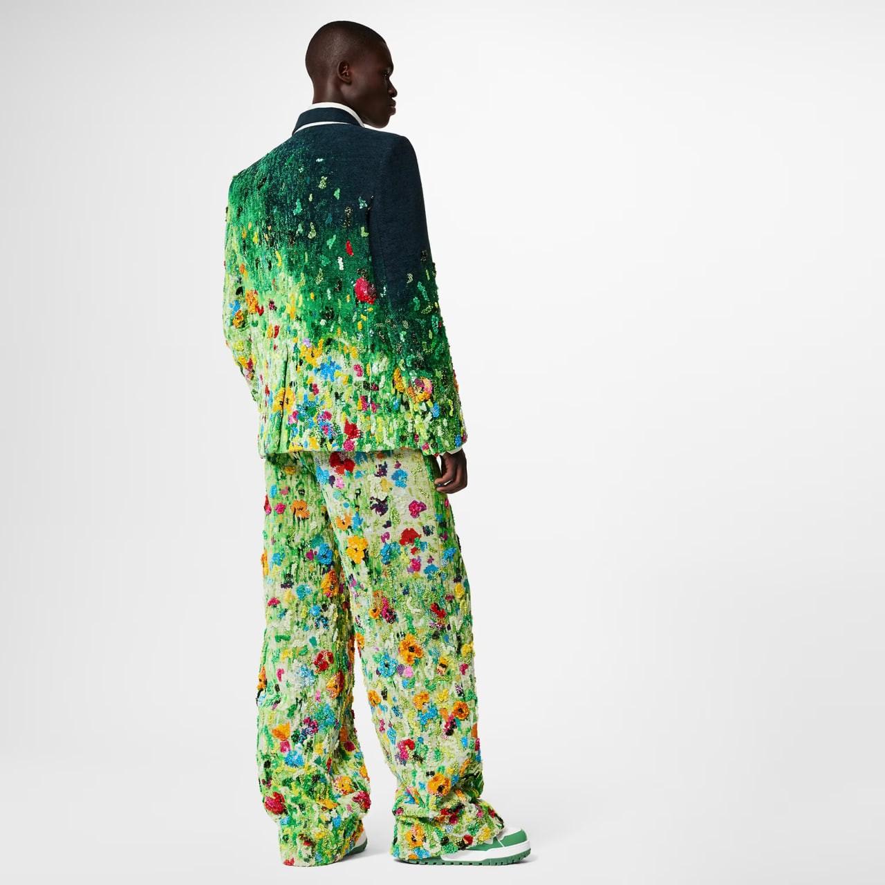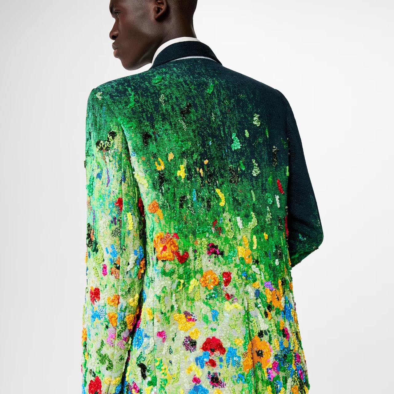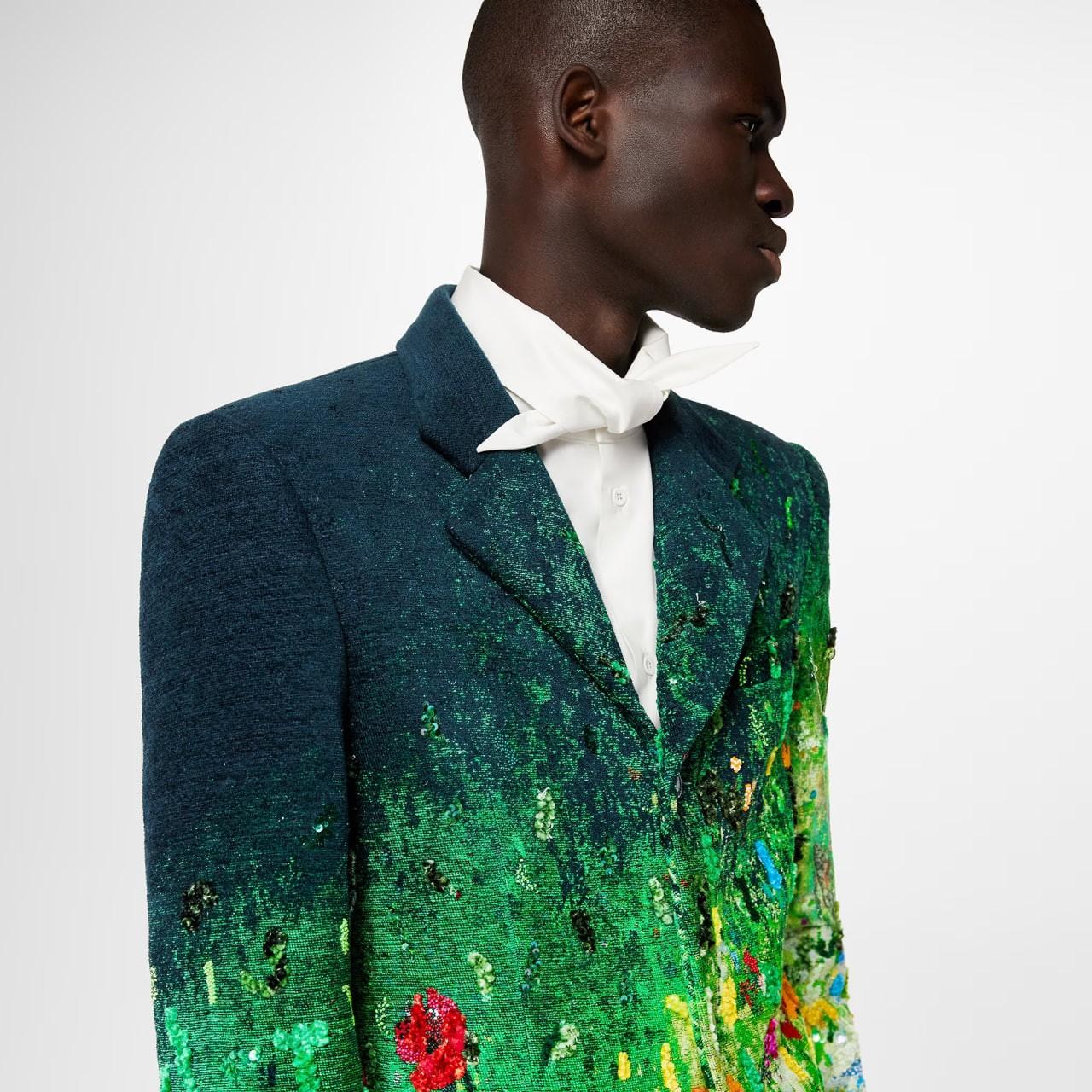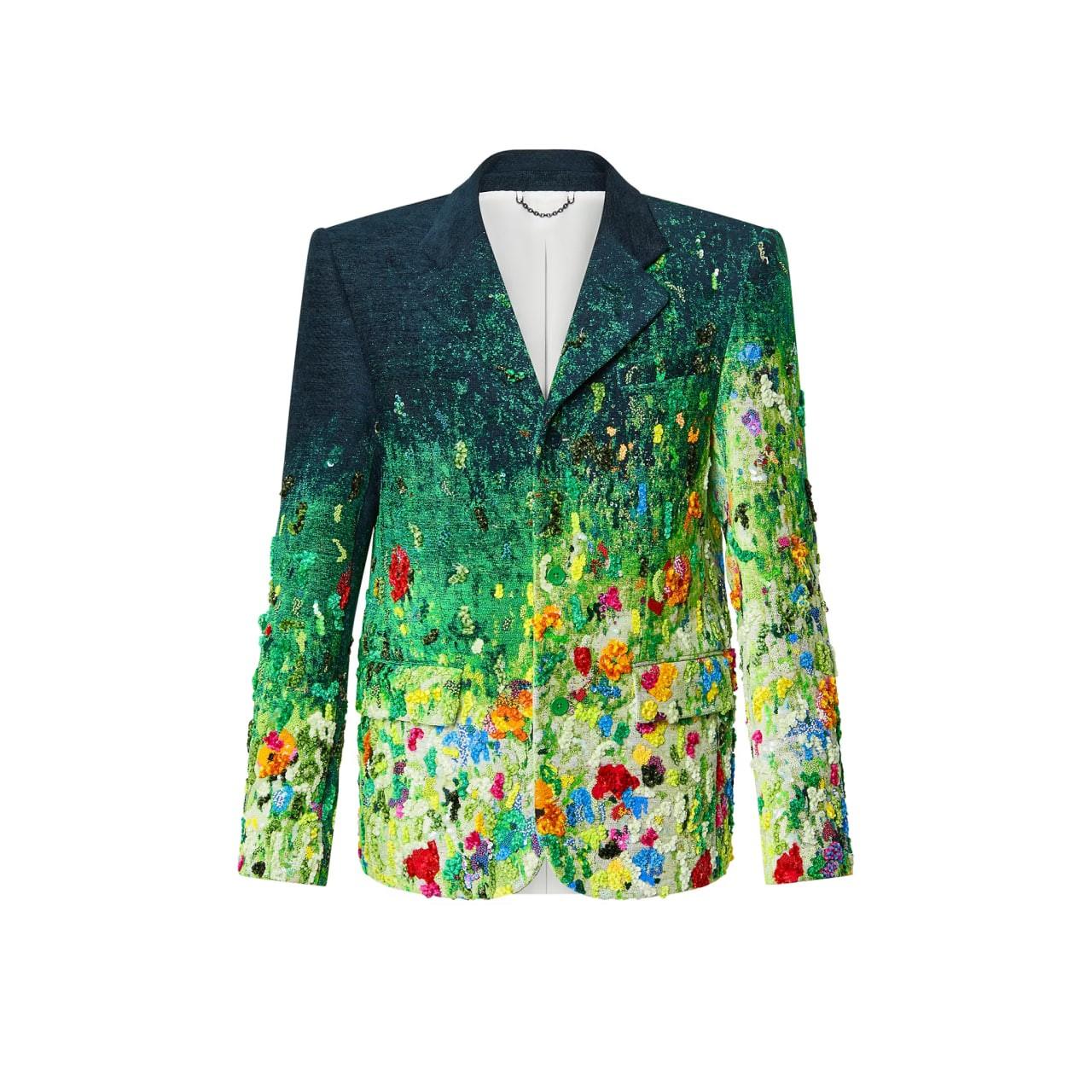 This intricately crafted tailored jacket features a complex jacquard motif in mottled green tones that shade from dark to light, inspired by Impressionist paintings of flower fields. It is encrusted with beaded and sequined embroidered flowers. Due to the exceptional work involved in its creation, this intricate, silk-lined piece is Made to Order.