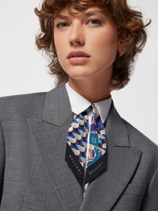 THE ROMAN GROUND SERIES MINI SHAWL, MADE OF BLACK FINELY PRINTED TWILL SILK MATERIAL, PAYS TRIBUTE TO BULGARI'S ENDLESS SOURCE OF INSPIRATION - THE GLORIOUS ROME. THE PATTERNS OF THE WORKS SHOW THE RICH CULTURAL HERITAGE OF THE BRAND, FROM THE MOSAICS THAT LIGHT UP THE INSPIRATION OF THE DIVAS' DREAM SERIES TO THE LEGENDARY COLOSSEUM, AS WELL AS THE CLASSIC ARCHITECTURAL ELEMENTS AND LANDSCAPES OF ROME AND BULGARI'S ICONIC SYMBOLS, SUCH AS THE SNAKE AND THE PEACOCK, PRESENTING AN FANTASTIC "GRAND PARADE". THIS PIECE IS EXTREMELY VERSATILE AND STYLISH: IT CAN BE TIED AROUND THE NECK OR WRIST, WORN AS A HAIR ACCESSORY, OR ADORNED WITH A BAG OR HAT. 5 X 85 CM - 2 X 33.5 IN. HANDMADE IN ITALY.