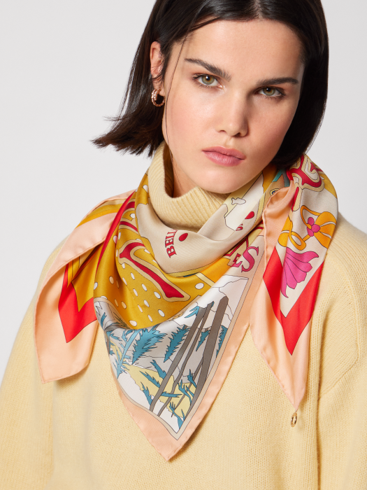 VIAGGIO DI SOTIRIO SERIES SCARVES ARE MADE OF SHELL QUARTZ PINK EXQUISITELY PRINTED TWILL SILK MATERIAL, PAIRED WITH BULGARI BULGARI SERIES METAL PENDANTS, FOLLOWING THE FOOTSTEPS OF BRAND FOUNDER SOTIRIO BULGARI (SOTIRIO BULGARI) TO START A DREAM JOURNEY THROUGH TIME AND SPACE TRIP. FROM GREECE TO ROME, FROM NAPLES TO SANREMO, FROM BELLAGIO TO ST. MORITZ, THESE CREATIVE PATTERNS TRACE HIS PATH TO SUCCESS, ADORNED WITH VINTAGE-INSPIRED POSTCARDS FEATURING BULGARI JEWELERY CREATIONS, AND WITH THE ORIGINAL VERSION OF THE BRAND LOGO. THIS VERSATILE PIECE CAN BE WORN IN DIFFERENT STYLES: TIED AROUND THE NECK FOR A TIMELESS LOOK, TIED AROUND THE WAIST FOR A FEMININE BELT, OR TIED AS A HAIR ACCESSORY FOR A STYLISH LOOK. 90 X 90 CM - 35.4 X 35.4 INCHES. 100% SILK TWILL. HANDMADE IN ITALY