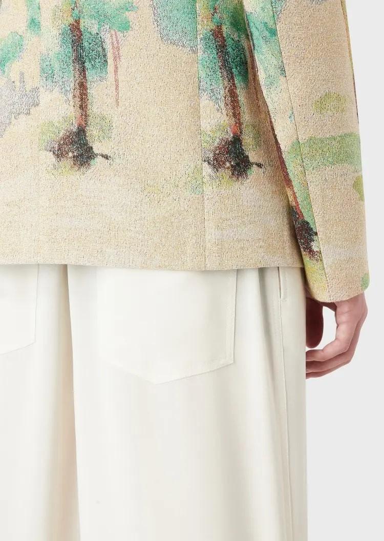 This EMPORIO ARMANI blazer adopts a lapel single-breasted version. The characteristic texture weaving and palm tree pattern reminds people of summer travel and play. It can easily create a holiday atmosphere and is suitable for matching with other items in the same series.