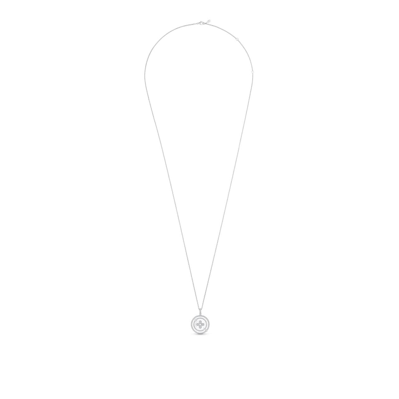The Idylle Blossom collection pays tribute to the Monogram Flower, with modern pieces like this medallion necklace, cast from 18-karat white gold and illuminated with brilliant diamond pavé. With an adjustable chain that allows for different stylings, this elegant yet playful jewel can be worn alone or layered with other models from the Idylle Blossom line.