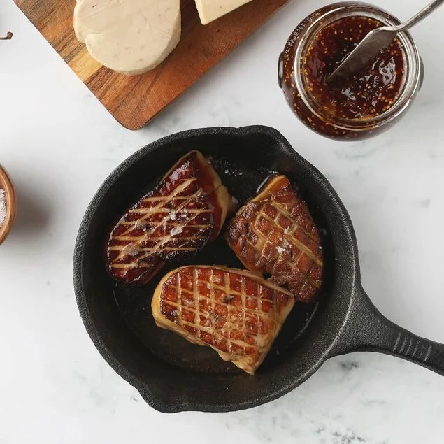 Cooking Tips: Our individually frozen foie medallions are a great way to indulge on a whim. Slices can be thawed or cooked straight from the freezer. To cook from frozen, preheat the oven to 450 degrees F. Season the medallions liberally with salt. Pre-heat a skillet over high heat until very hot, then sear the foie gras slices for about 15 seconds on each side. Place the seared medallions on a baking sheet and finish cooking in the oven for no more than 4 minutes. Serve immediately. For a classic dish, serve with fig or plum jam and toasted brioche. But don't be afraid to get creative as seared foie gras is surprisingly versatile. Try it with sautéed apples and a cider reduction, on a hot waffle with maple syrup, or as a decadent topping for a burger. The possibilities are endless.