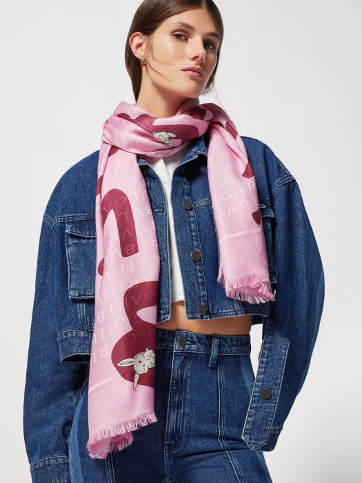 CELEBRATE THE LUNAR NEW YEAR IN A PLAYFUL WAY WITH THE LETTERE MAXI RABBIT SHAWL IN FINE SILK WOOL WITH JASMINE QUARTZ PINK. THE DESIGN IS NOVEL, AND THE COLORFUL BULGARI LOGO IS EMBELLISHED WITH THE IMAGE OF A CHEERFUL AND LEISURELY BUNNY, INTERPRETING THE ICONIC BULGARI BULGARI BRAND LOGO PATTERN IN A UNIQUE AND MODERN WAY. AVAILABLE IN A VARIETY OF STYLING OPTIONS, IT CAN BE STYLED AROUND THE NECK OR DRAPED OVER THE SHOULDERS. 70 X 180 CM - 27.6 X 70.8 INCHES. HANDMADE IN ITALY