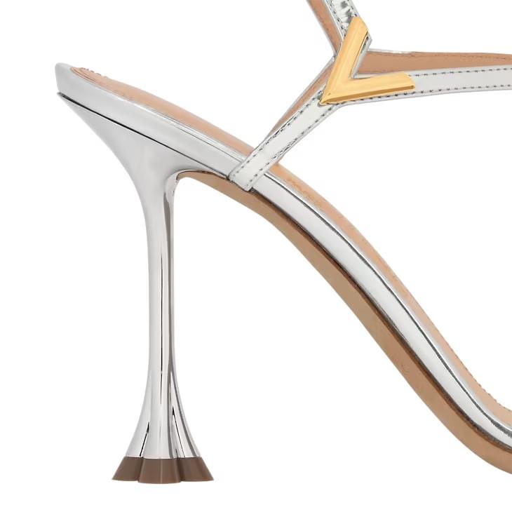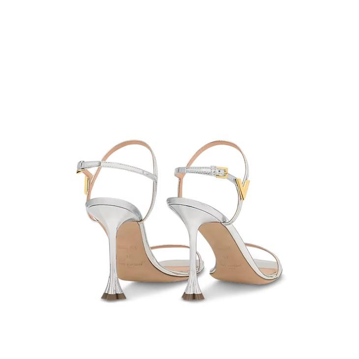 This glamorous version of the Blossom sandal comes in mirror-effect, metallic calf leather. This model is characterized by its slender straps and high, Monogram Flower-shaped heel. The ankle strap is adjusted with a tiny, gold-tone buckle and embellished with a distinctive V accessory.