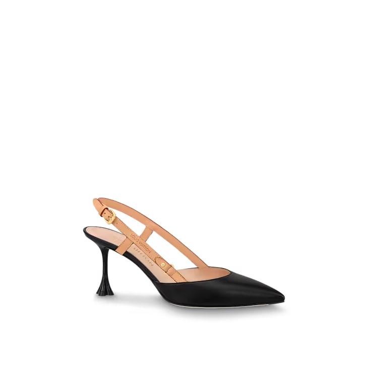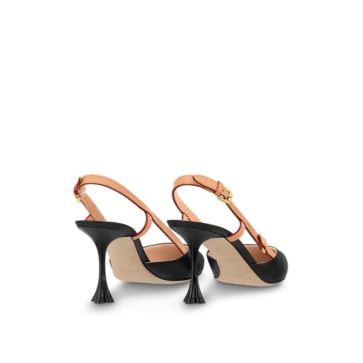 This iteration of the Blossom slingback pump combines two refined materials: soft nappa lambskin for the upper and natural leather for the back strap. Evoking iconic Louis Vuitton luggage, the strap bears the House signature and an engraved, gold-tone stud. This model has a distinctive heel in the shape of a round Monogram Flower.