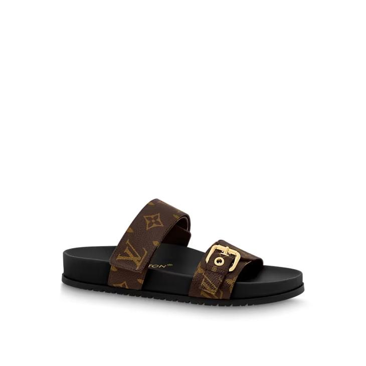 The Bom Dia flat comfort mule combines fashion and function in Louis Vuitton's signature Monogram canvas. This model is notable for its two adjustable straps: one with velcro, the other with an engraved, gold-tone buckle. An anatomic insole and a slip-resistant rubber outsole complete this effortless, on-trend style.