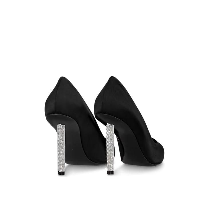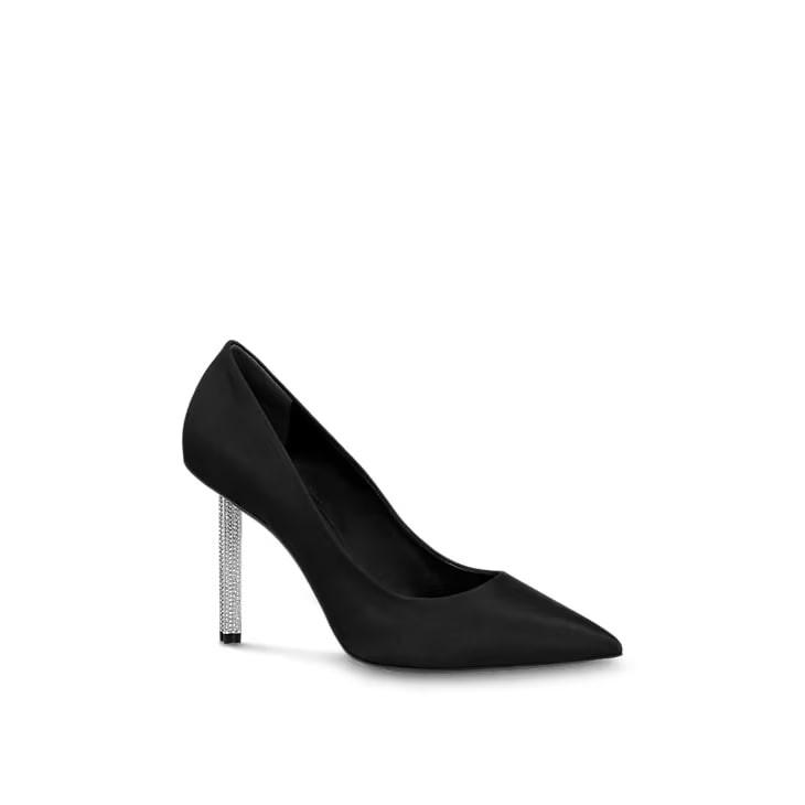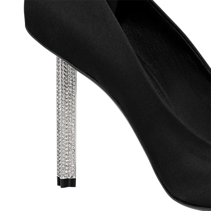 The Diva pump is an elegant design that combines smooth black satin with sparkling crystals on its high heel, which takes the shape of one of Louis Vuitton's iconic Monogram Flowers. Perfect for special occasions, this sophisticated style is finished with a fine leather outsole.