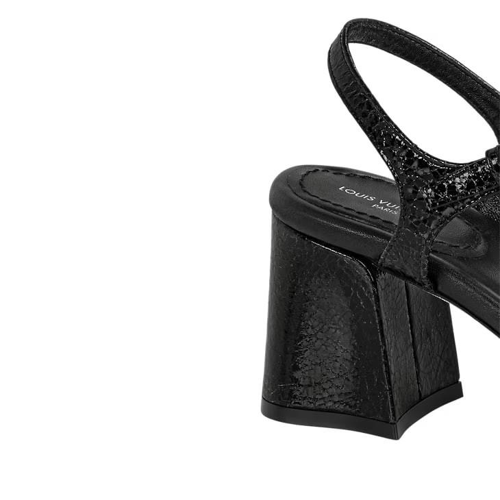 The LV Edge sandal is crafted from metallic calf leather with a distinctive crinkled finish. The front strap is accessorized with an angular, Monogram-engraved chain, which was inspired by the emblematic Coussin bag. This elegant model has a stable block heel, a comfortable lambskin insole and a supple leather outsole.