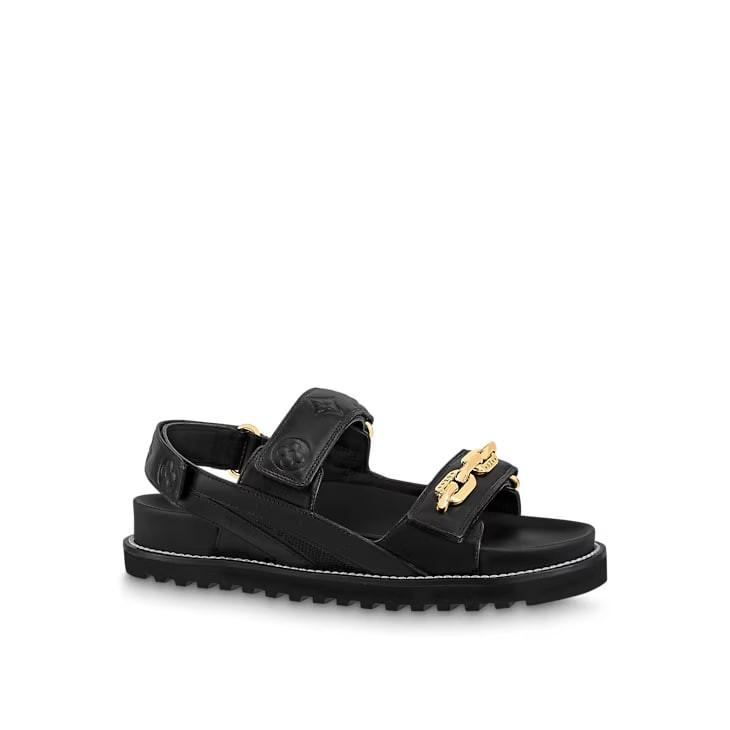This elevated interpretation of the Paseo flat comfort sandal comes in soft, padded lambskin, which is embossed with the Monogram pattern. The front strap is embellished with a graphic, gold-tone chain inspired by the emblematic Coussin handbag. Other key features of this design are its adjustable velcro straps and ultra-lightweight micro outsole.