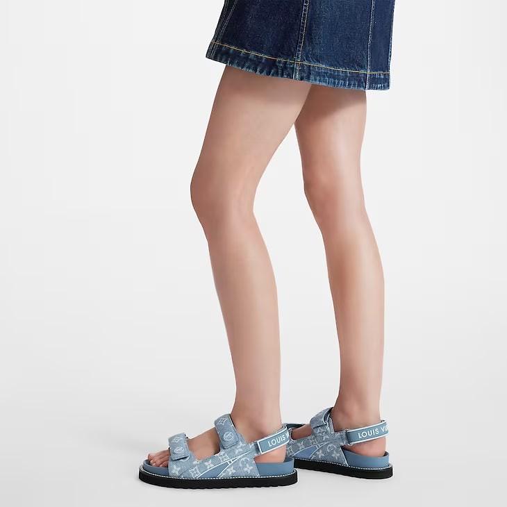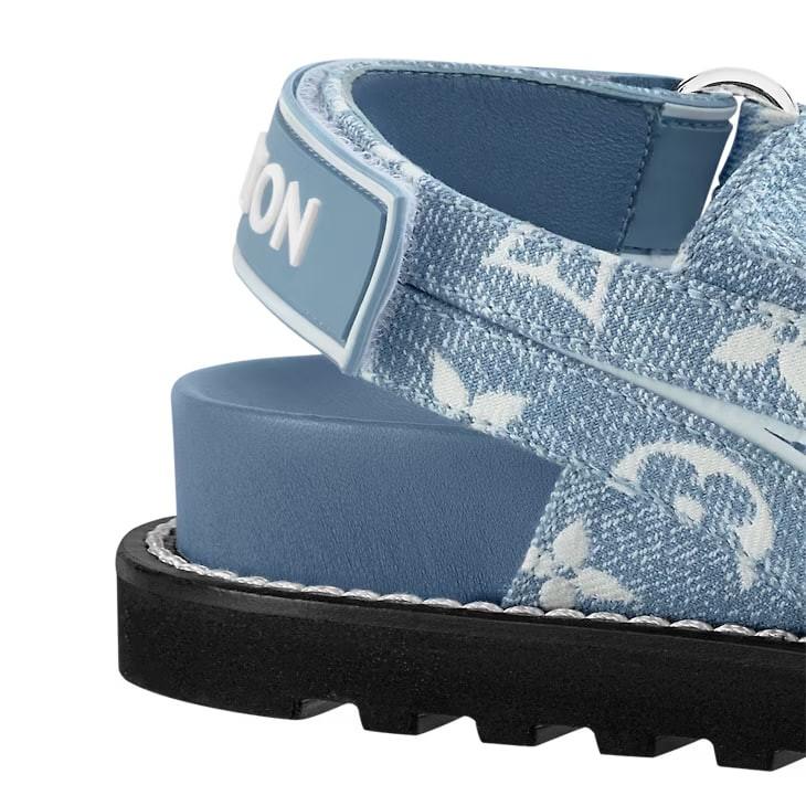 The Paseo flat comfort sandal comes in Monogram denim for a relaxed, summery look. This model is notable for its three adjustable straps with rubber LV Circle and Louis Vuitton signatures inspired by the cult LV Archlight sneaker. It is finished with a comfortable anatomic footbed and a lightweight micro outsole.