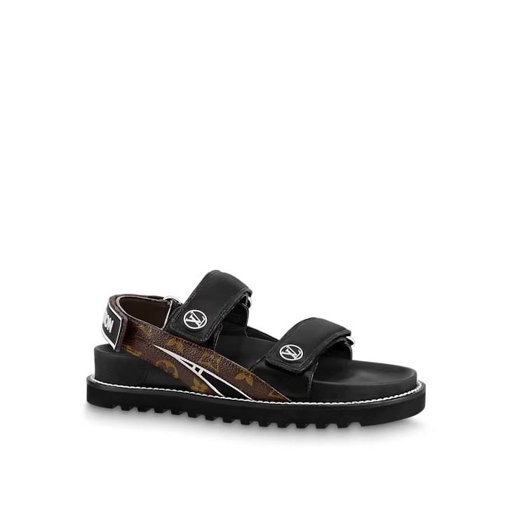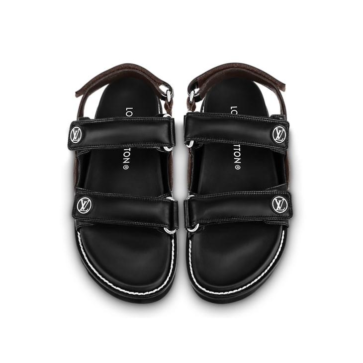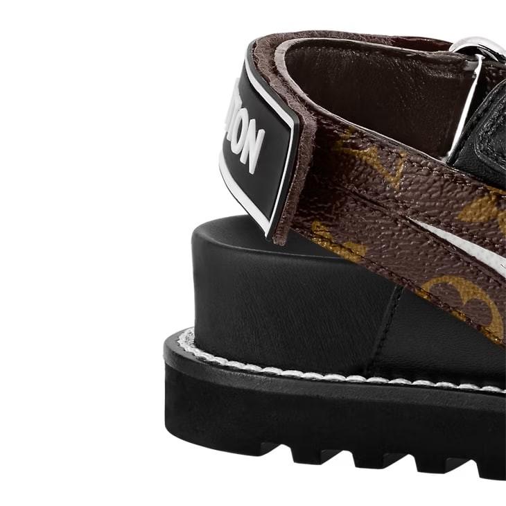 The Paseo flat comfort mule combines soft lambskin with Louis Vuitton's iconic Monogram canvas. This model features two adjustable front straps and an adjustable back strap with rubber LV Circle and Louis Vuitton signatures, which reference the LV Archlight sneaker. An anatomic footbed and a micro outsole offer comfort and lightness.