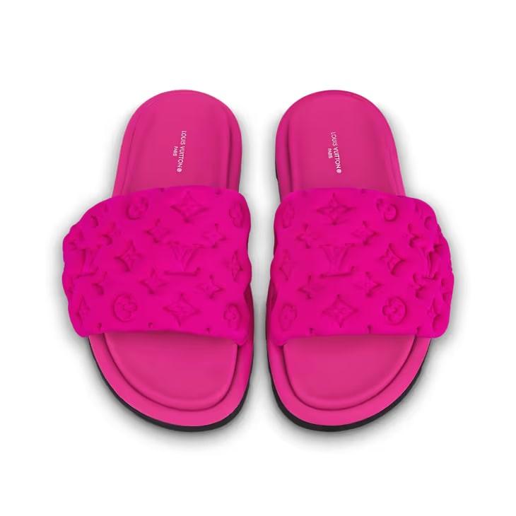 This version of the Pool Pillow flat comfort mule comes in neoprene embossed with Louis Vuitton's iconic Monogram pattern. The wide front strap is padded for comfort and adjusted with velcro for convenience. This model is finished with an anatomic footbed and a treaded micro outsole.