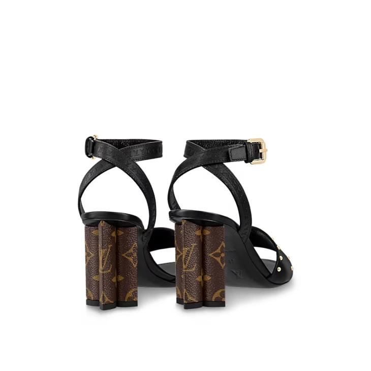 The Silhouette sandal is a refined style combining a calf leather upper with an iconic Monogram Flower-shaped heel covered with patent Monogram canvas. Key details evoke historic Louis Vuitton trunks: the tiny, gold-tone studs decorating the front strap, and the row of LV Initials discreetly embossed on the ankle strap.