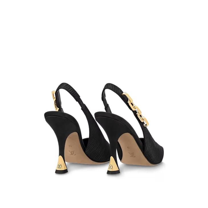The Sparkle slingback pump is a sophisticated style crafted from Epi satin, which evokes the distinctive grain of the House's emblematic Epi leather. It is distinguished by its feminine pointed toe and flared heel with an LV Circle-engraved insert. The elasticized back strap is embellished with an angular, Monogram-engraved chain inspired by the Coussin bag.