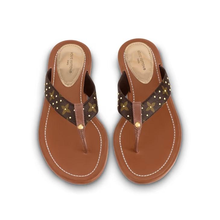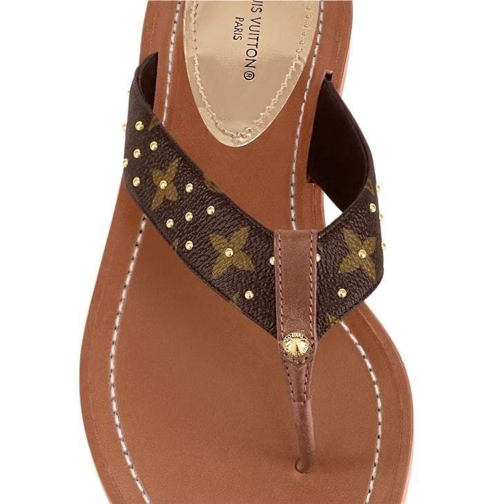 Combining Louis Vuitton's iconic Monogram canvas with calf-leather trim, the Sunny flat thong is both elegant and easy-to-wear. Its V-shaped strap is embellished with tiny, gold-tone studs, inspired by the House's historic trunks, while a larger, engraved stud signs the front. This model is finished with a durable leather outsole.