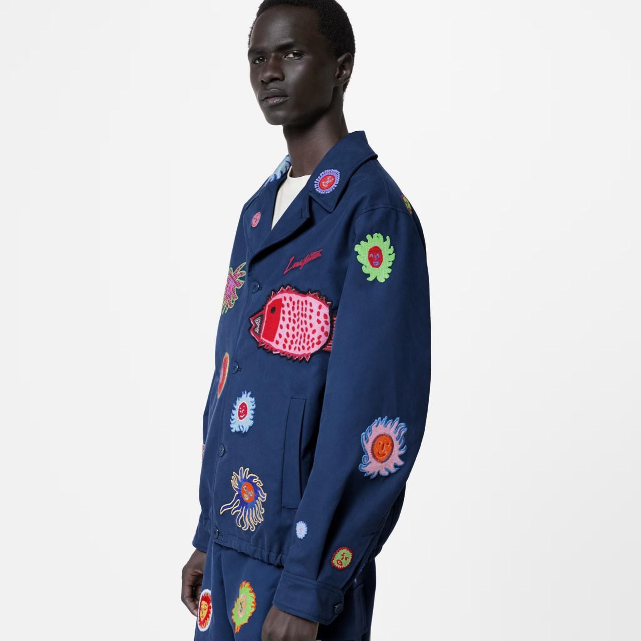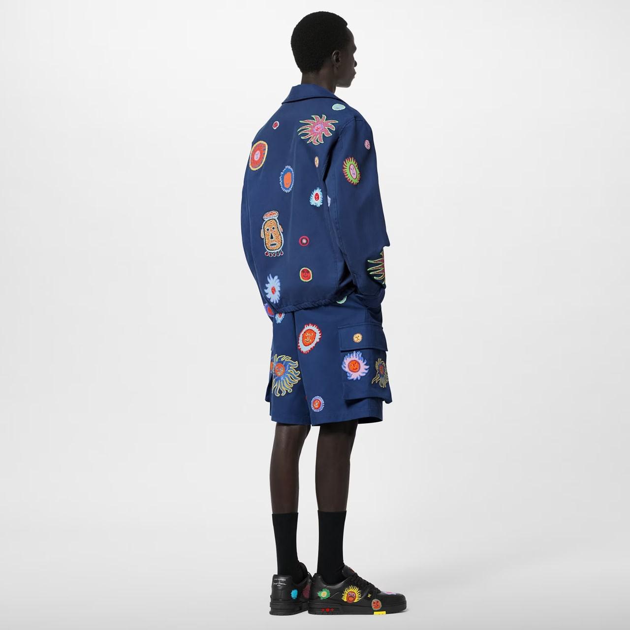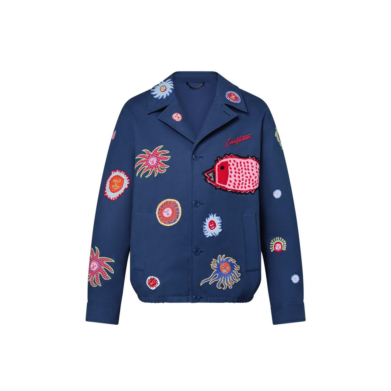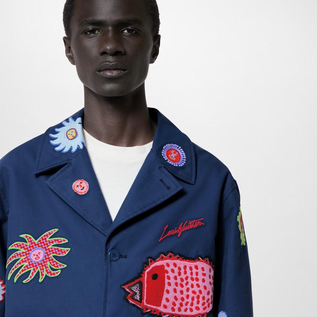 This playful vibrant blue cotton blouson is from the second drop of the exclusive Louis Vuitton x Yayoi Kusama collaboration. The casual silhouette is embellished with eye-catching embroidered patches featuring colorful images from "My Eternal Soul," a series of paintings which the venerated Japanese artist began in 2009, together with a Louis Vuitton signature on the left chest. This piece can be paired with matching shorts or pants for a bold look.