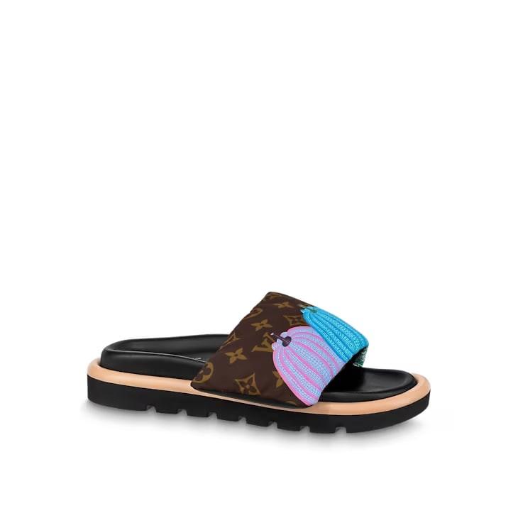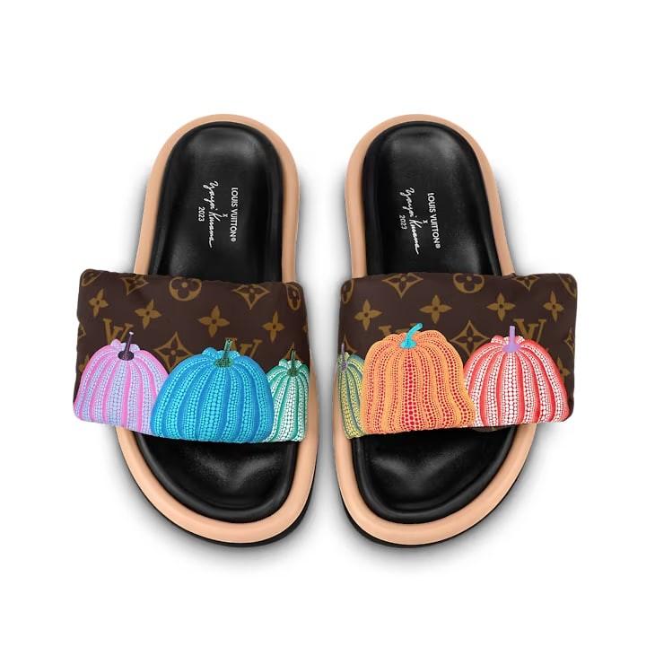 For the Louis Vuitton x Yayoi Kusama collection, the LV x YK Pool Pillow flat comfort mule comes in Monogram nylon with a colorful Pumpkins print, evoking a recurring theme of the Japanese artist's work. This model's wide front strap is padded with feathers and adjusted with velcro, while the lightweight micro outsole has a contour in nappa leather.