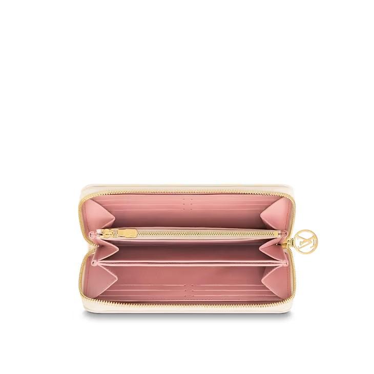 Fashioned from puffy lambskin with the Monogram pattern embossed and printed on the leather, this Zippy Wallet seduces with its ultrafeminine colorway and gold-color zipper. A practical everyday wallet, the Zippy has a multitude of gusseted compartments, pockets, and card slots for cash, coins, and other essentials.