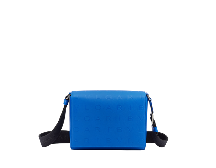 BULGARI BULGARI HOMME SMALL MESSENGER BAG IN OLYMPIC SAPPHIRE BLUE SMOOTH AND GRAINED METAL-FREE CALFSKIN WITH HOT-STAMPED BULGARI LOGO PATTERN AND OLYMPIC SAPPHIRE BLUE RECYCLED NYLON (ECONYL®) LINING FOR CONVENIENCE DESIGNED AND PRODUCED IN A SUSTAINABLE MANNER. EQUIPPED WITH A SHOULDER STRAP EMBROIDERED WITH THE BULGARI LOGO AND FEATURING A SINGLE COMPARTMENT, THE TIMELESS SHAPE EXUDES ELEGANCE AND SIMPLICITY. FEATURING A MAGNETIC FLAP, ONE BACK FLAT POCKET, TWO INNER FLAT POCKETS AND BULGARI METAL LOGO ON THE BACK. 22 X 18 X 8 CM - 8.7 X 7.1 X 3.1 INCHES. MADE IN ITALY.