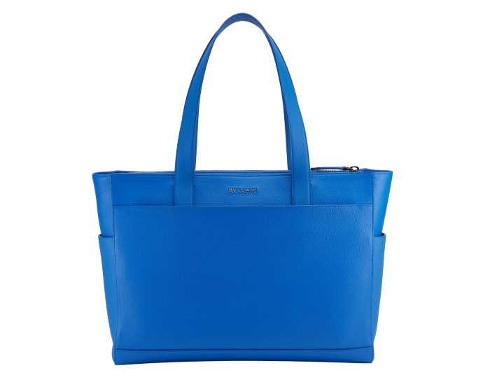 BULGARI HOMME LARGE HORIZONTAL TOTE BAG IN OLYMPIC SAPPHIRE BLUE SMOOTH AND GRAINED METAL-FREE CALFSKIN WITH OLYMPIC SAPPHIRE BLUE RECYCLED NYLON (ECONYL®) LINING, DESIGNED IN A SUSTAINABLE MANNER CRAFTED AND CRAFTED, THE TIMELESS SHAPE EXUDES ELEGANCE AND SIMPLICITY. BAG WITH TWO HANDLES, SIGNATURE BULGARI LOGO STAMPED ON THE FRONT, SINGLE COMPARTMENT, ZIP CLOSURE, ONE OPEN FRONT POCKET, ONE ZIPPED FRONT POCKET, ONE BACK PANEL POCKET, TWO SIDE OPEN POCKETS , ONE INTERNAL ZIP POCKET, FOUR OPEN POCKETS, AND BULGARI METAL LOGO ON THE BACK. 40 X 30 X 10 CM - 15.7 X 11.8 X 3.9 INCHES. MADE IN ITALY.