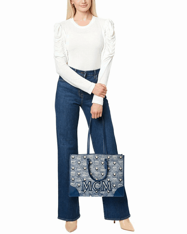 Mcm Vintage Jacquard Monogram Canvas Tote Women's Blue