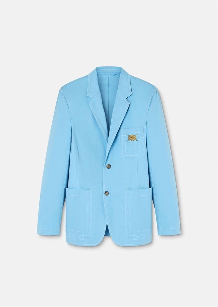 Slim fit blazer in lightweight cotton featuring a Medusa Biggie badge on the breast pocket. Jacket style featuring contrast stitching and multifunctional front patch pockets and side pockets.