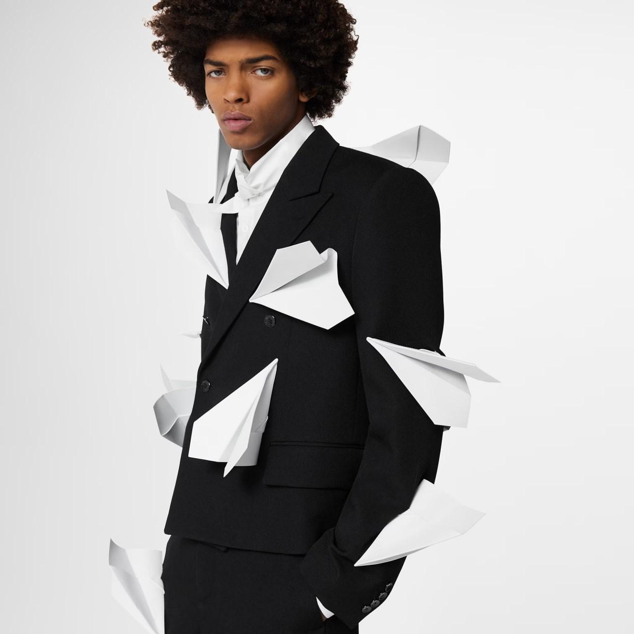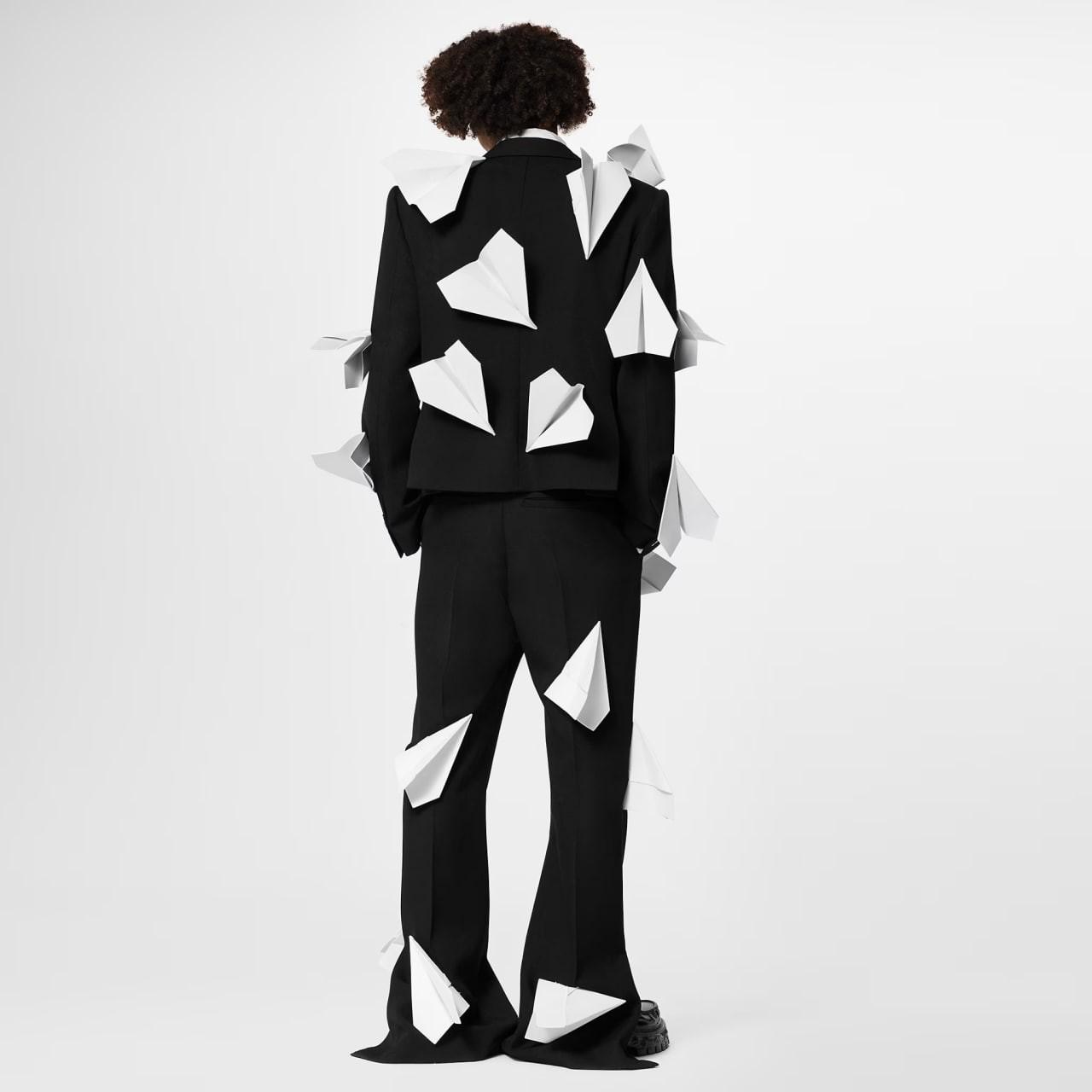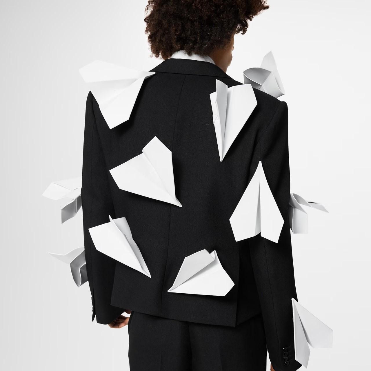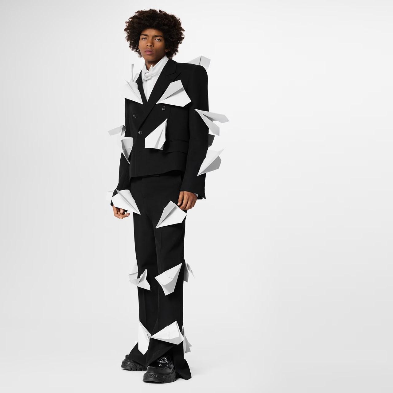 This straight-from-the-runway double-breasted tailored jacket features the iconic paper plane motif from the SS23 Show. Each of the 15 planes embellishing this Made to Order piece is handcrafted from leather, with a discreet Louis Vuitton Paris signature adorning the plane on the left chest. The cropped silhouette with a formal peak lapel and luxurious silk lining can be worn as a suit with matching pants.