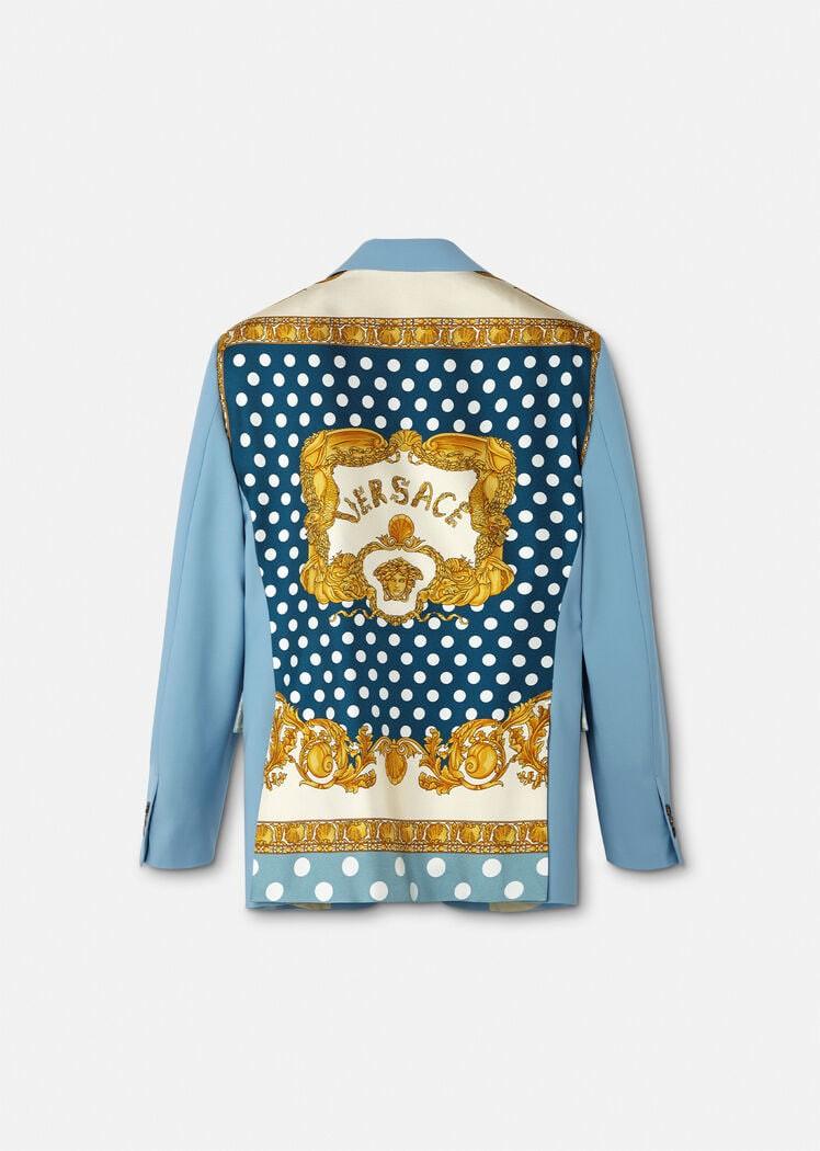 Single-breasted wool blazer with a silk Seashell Baroque Polka Dot print inlay on the back.