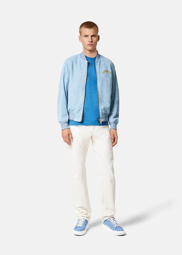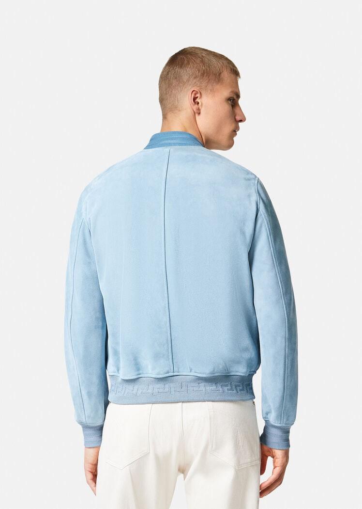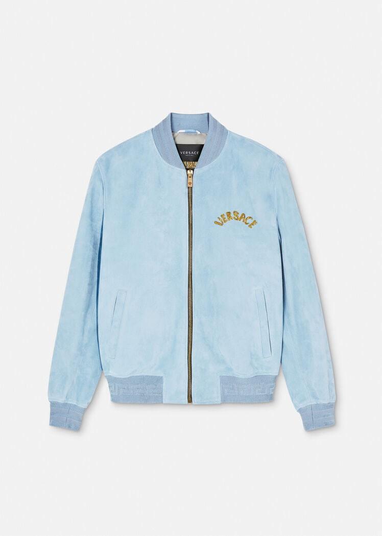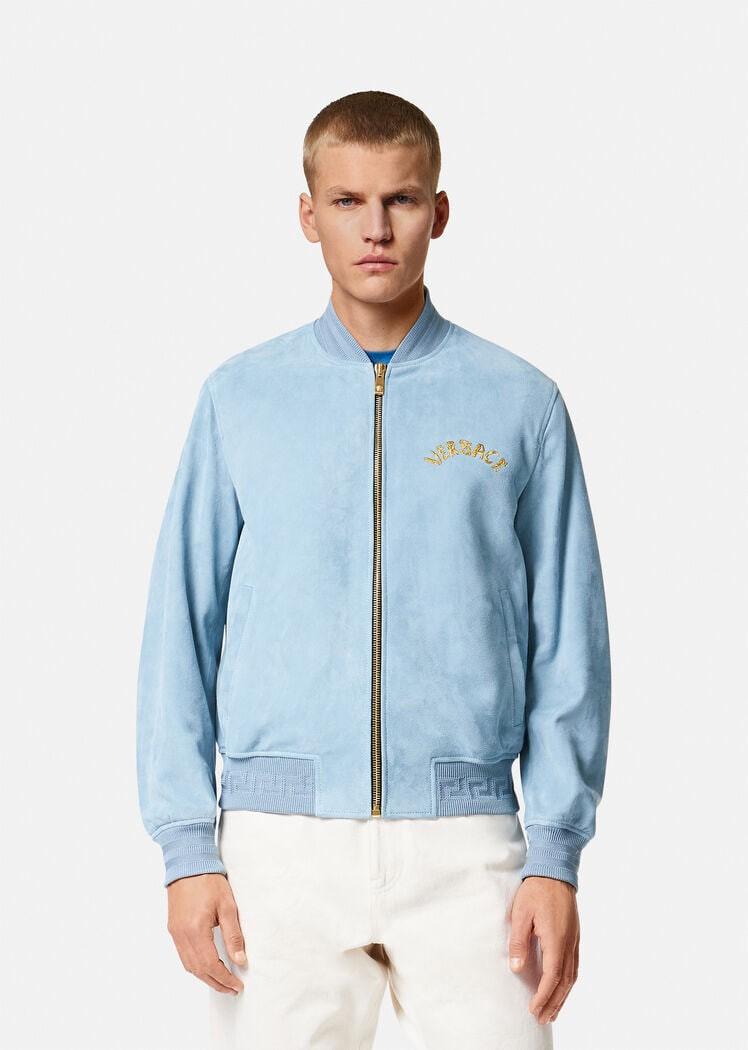 Suede bomber jacket with Greca rib knit trim and logo embroidery on the chest. Fully lined jacket style featuring the Seashell Baroque Polka Dot print.