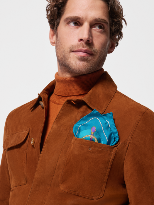 THE SERPENTI 75 SERIES LIGHT BLUE DELICATE PRINTED TWILL SILK POCKET SQUARE PAYS TRIBUTE TO THE 75TH ANNIVERSARY OF THE BULGARI CLASSIC SERIES THAT SYMBOLIZES ENDLESS TRANSFORMATION. THE PRECIOUS SNAKES ARE INTERTWINED AND INTERTWINED, WINDING AROUND THE ICONIC SERPENTINE CHAIN OF BULGARI BULGARI LEATHER WORKS-THIS PATTERN CLEVERLY INTERPRETS THE CREATIVE CHARM AND FASCINATING TRANSFORMATION OF THE SERIES FOR 75 YEARS. SMART AND TIMELESS, THIS ACCESSORY ADDS A TOUCH OF COLOR AND SOPHISTICATION TO ANY LOOK. 30 X 30 CM - 13 X 13 INCHES. 100% SILK TWILL. HANDMADE IN ITAL