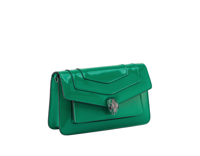 THE SERPENTI FOREVER EAST-WEST SMALL SHOULDER BAG IS MADE OF BRIGHT EMERALD GREEN GLOSSY NUBUCK CALFSKIN, CREATING A MODERN AND UNIFORM GLOSS EFFECT, INTERPRETING THE TIMELESS CLASSIC STYLE WITH A FASHIONABLE AND AVANT-GARDE SHAPE. FITTED WITH A FUNCTIONAL LEATHER SHOULDER STRAP, IT IS FINISHED WITH THE ICONIC SNAKEHEAD MAGNETIC CLOSURE, WHOSE SEDUCTIVE SCALES AND DESIGN ARE INSPIRED BY THE SERPENTI JEWELRY COLLECTION OF THE 1960S, MAKING IT SUITABLE FOR EVERYDAY WEAR. FEATURING ONE SINGLE COMPARTMENT, ONE FRONT POCKET, ONE BACK PANEL POCKET, ONE INTERNAL BONE POCKET, THREE CARD SLOTS, ONE CUSTOMIZABLE VANITY MIRROR AND BULGARI METAL LOGO ON THE BACK. 22 X 13 X 5.5 CM - 8.7 X 5.1 X 0.7 INCHES. MADE IN ITALY.