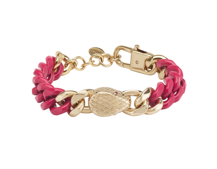 SERPENTI FOREVER MAXI CHAIN BRACELET IN BRASS LIGHT GOLD PLATED, PARTIALLY ADORNED WITH BEET RED SPINEL FUCHSIA ENAMEL, COMBINING A THICK "GOURMETTE" (CHAIN) CHAIN INSPIRED BY PIECES OF HIGH JEWELRY WITH A SEDUCTIVE SNAKE DETAIL PENDANT DECORATED. AT THE CENTER OF THE PIECE IS THE CAPTIVATING CLASSIC SNAKE HEAD, A CHARMING INTERPRETATION OF THE COLLECTION'S SIGNATURE DECORATION, INSPIRED BY A BULGARI WATCH FROM THE 1960S. ADJUSTABLE BUCKLE. 15.5 - 17.5 CM; 6.1 - 6.9 INCHES (FOR WRIST). MADE IN ITALY.