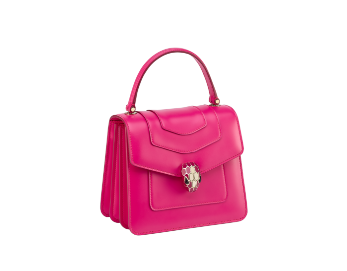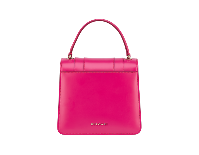 SERPENTI FOREVER SMALL HANDBAG, MADE OF GENUINE TOURMALINE ROSE CALFSKIN, SUBTLY BLENDS MODERN STYLE AND VERSATILE CHARM. FINISHED WITH A SNAKE-SHAPED CHAIN AND LEATHER SHOULDER STRAP, IT IS ADORNED WITH THE ICONIC SNAKE HEAD MAGNETIC CLOSURE, WHOSE ALLURING SCALES AND DESIGN ARE INSPIRED BY THE SERPENTI JEWELRY SERIES OF THE 1960S. FEATURES THREE COMPARTMENTS, AN EXTERNAL BACK POCKET WITH STITCHING, AN INTERNAL OPEN POCKET, AND A MIRROR POCKET WITH A CUSTOMIZABLE VANITY MIRROR WITH METAL BULGARI LOGO ON THE BACK. 18.5 X 16 X 10.5 CM - 7.3 X 6.3 X 4.1 INCHES. MADE IN ITALY.