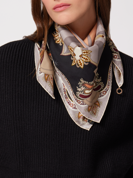 SERPENTI PAISLEY SERIES SCARVES, MADE OF BLACK FINELY PRINTED SILK MATERIAL, PAIRED WITH BULGARI BULGARI SERIES METAL PENDANTS, SUBTLY INTEGRATE BULGARI'S CLASSIC SYMBOLS INTO A WORLD FULL OF DREAMS AND IMAGINATION. EACH ELEMENT UNFOLDS A MAGICAL TRANSFORMATION, SURROUNDED BY BULGARI'S CLASSIC OCTAGONAL PATTERN IN THE CENTER, DESIGNED IN A GEOMETRIC STYLE, SHOWING ENDLESS AND FASCINATING CREATIVE METAMORPHOSIS, REMINISCENT OF THE CONTINUOUS EVOLUTION OF PAISLEY AND GEOMETRIC PATTERNS. THIS VERSATILE PIECE CAN BE STYLED IN DIFFERENT STYLES: TIED AROUND THE NECK FOR A TIMELESS LOOK; TIED AROUND THE WAIST FOR A FEMININE BELT; TIED AS A HAIR ACCESSORY FOR A STYLISH LOOK; OR ADORNED WITH A HANDBAG FOR A PERSONALIZED LOOK. 70 X 70 CM - 27.6 X 27.6 INCHES. 100% SILK. HANDMADE IN ITALY